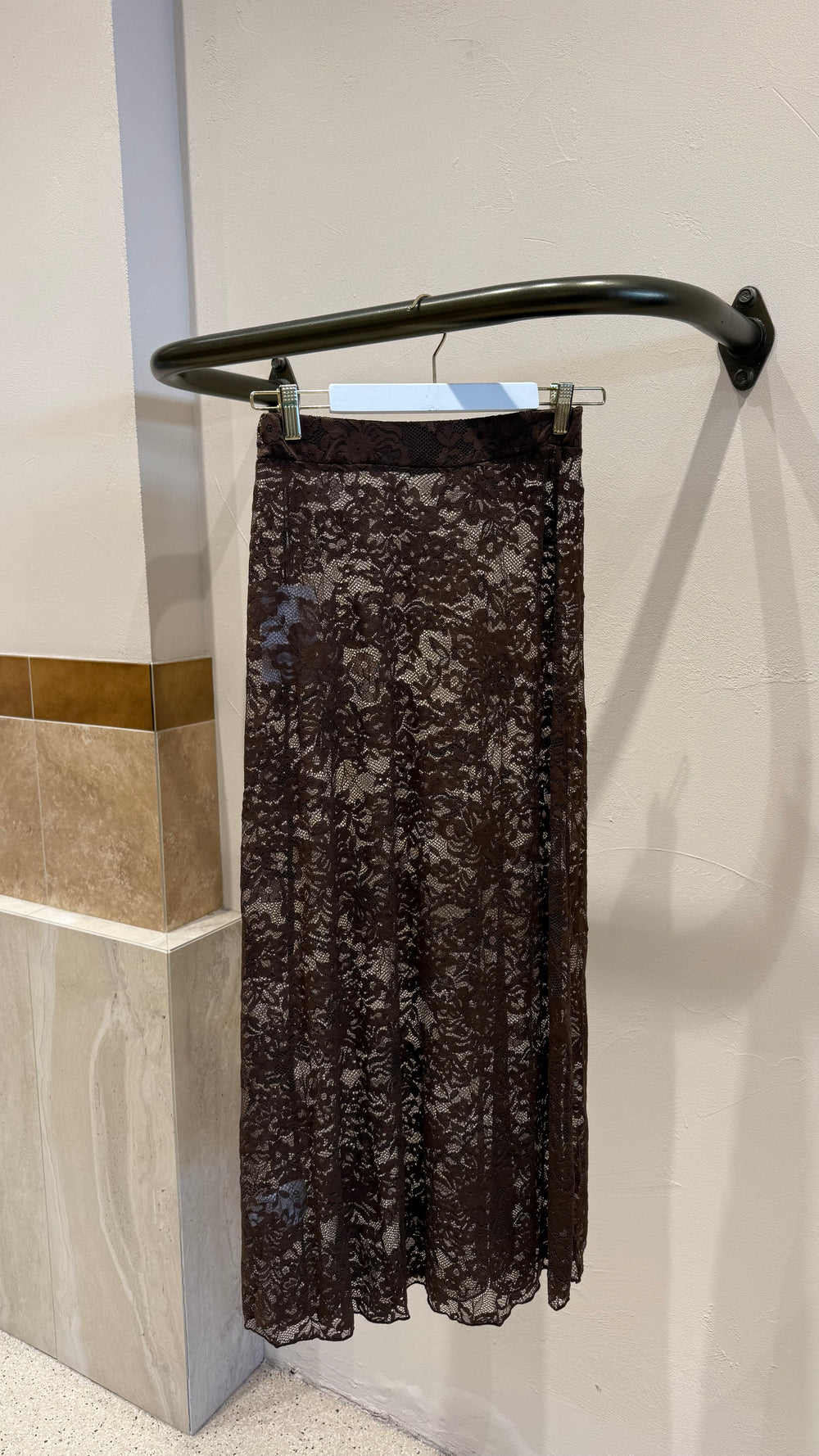 The Ella Lace Skirt in Brown features an elasticated waistband, midi length and sheer lace fabric. Pair with your go-to undergarments and heels for a chic and on-trend look, or a baggy t-shirt for an elevated everyday look!