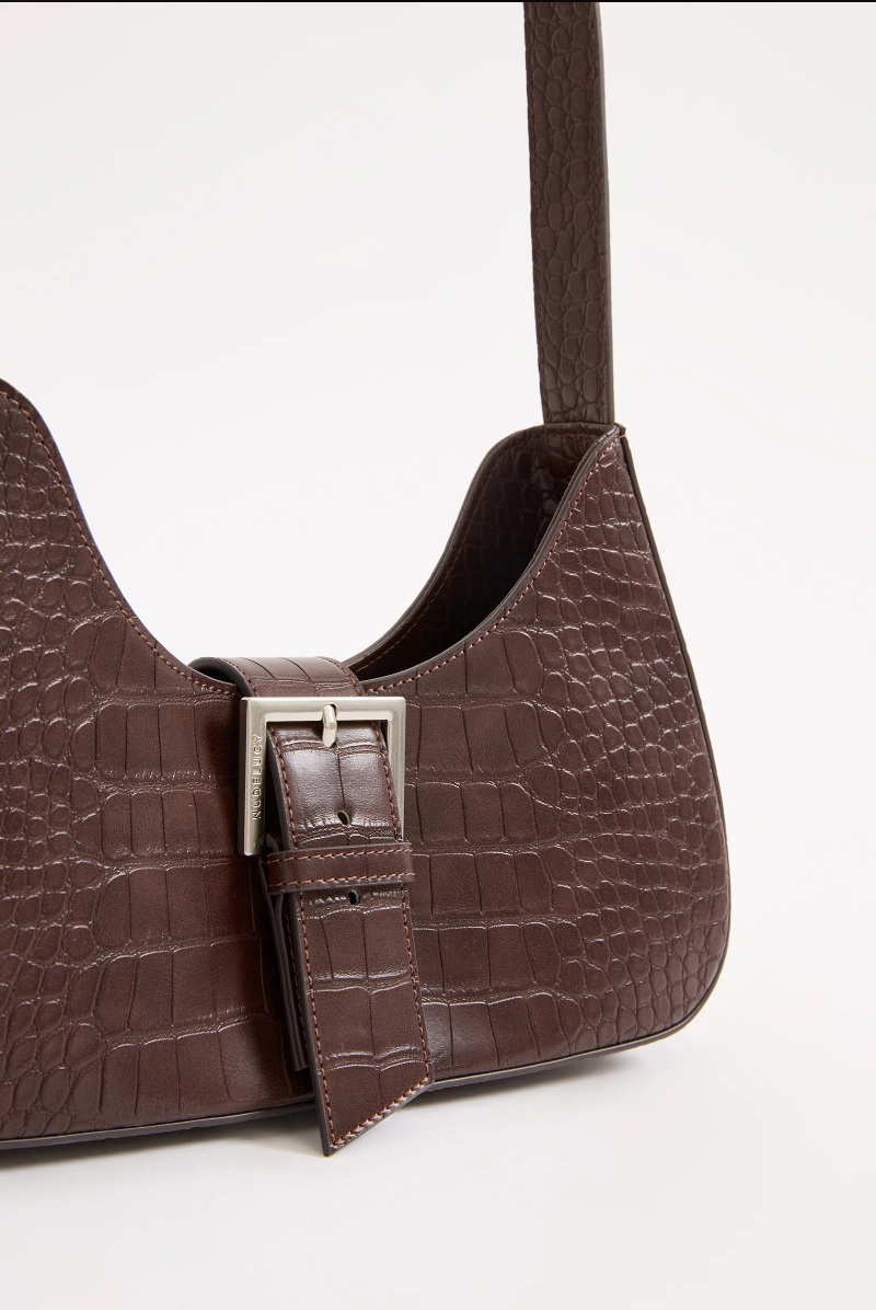 The Greta Shoulder Bag is made from a vegan leather which has a textured, croc finish. The shape Features include internal pocket with zipper, functional buckle with Nude Lucy branding and inside snap butto