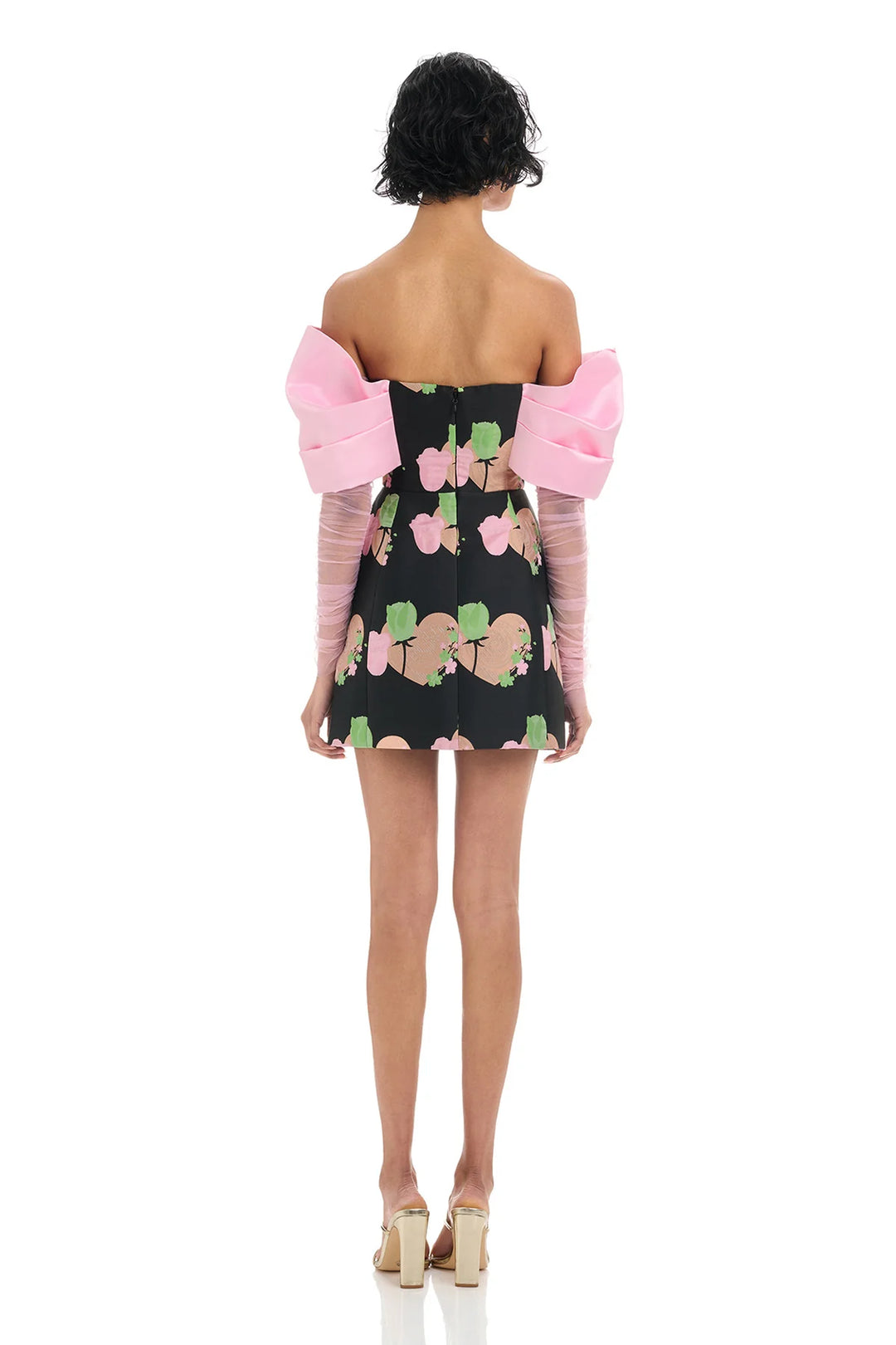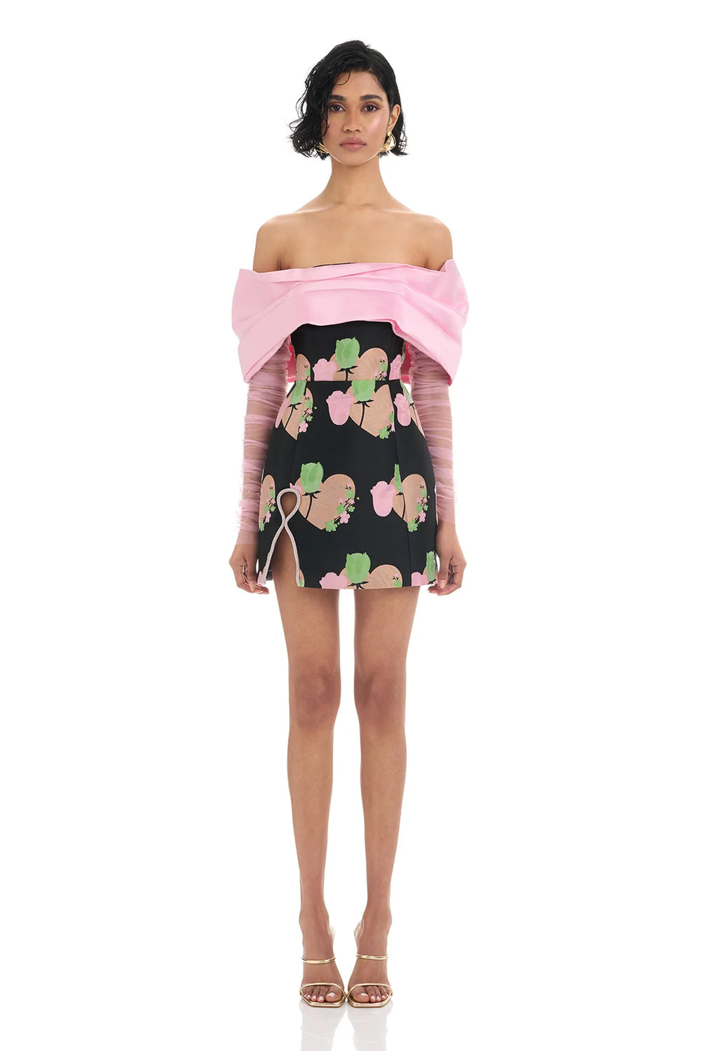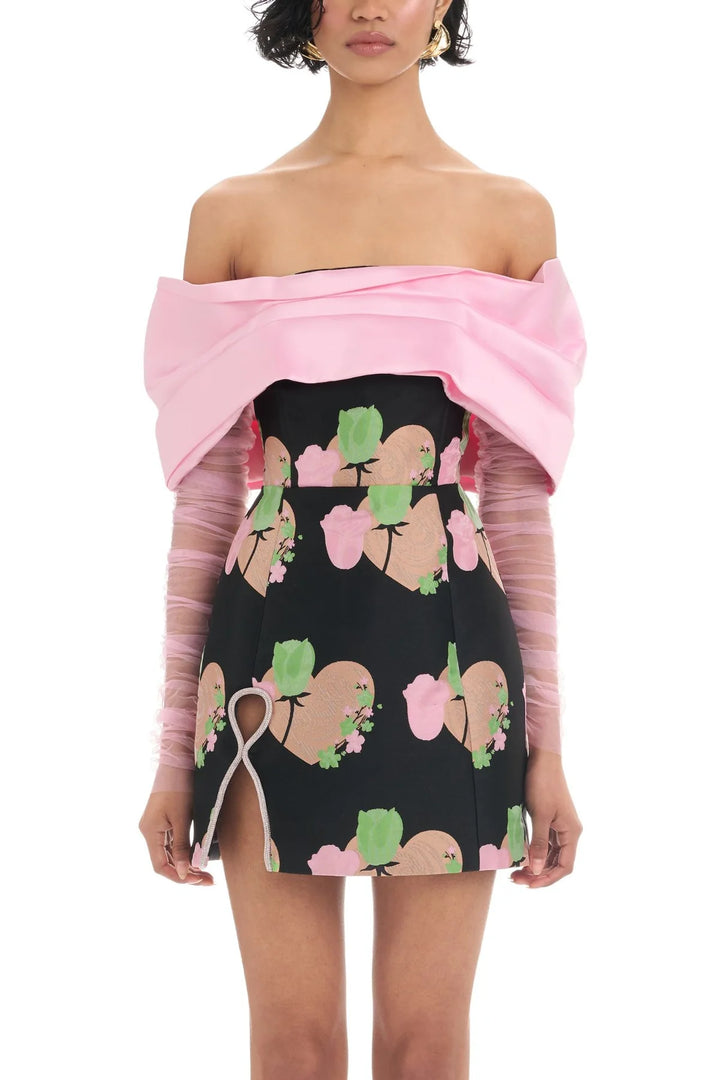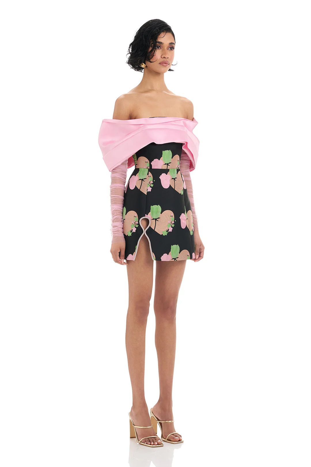 With an off-the-shoulder design and ruched mesh sleeves, the Kyros Dress is a chic mini dress that is crafted from a floral jacquard and contrasting pink fabrication. The Kyros Dress is adorned with a decorative front side split and sculptural off-the-shoulder details for a playful touch. Finished with an invisible zipper at the centre back and fully lined for comfort, the Kyros Dress combines both elegance and fun for a modern twist.