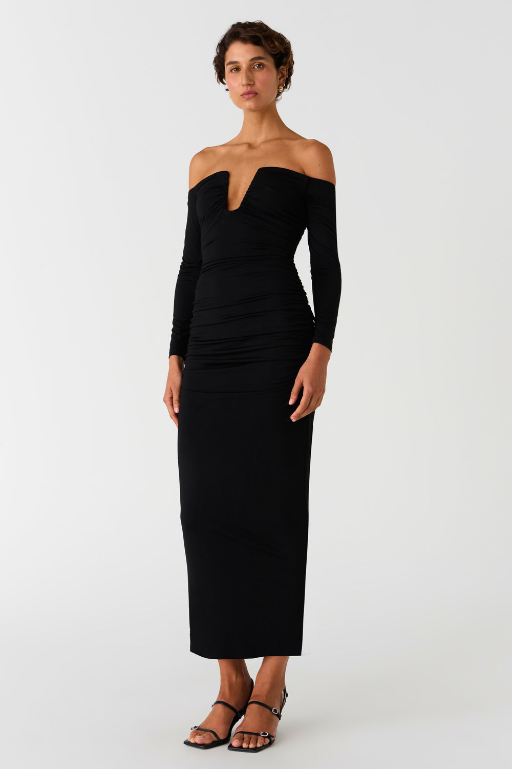 The Raelynn in Black, a sophisticated and refined take on an off-the-shoulder silhouette. Raelynn highlights the decolletage and cleavage, creating a sensual allure. This is balanced by the longer-line skirt and long-sleeve detail. Pair Raelynn with a pointed toe pump or strappy sandal to complete the look. The perfect dress for any evening event.