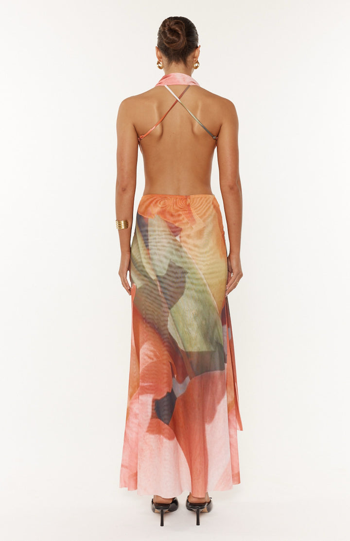 Hello Vivienne ! With her crafted neck drape that adds a sense of fluidity and elegance to the overall silhouette. The soft, flowing fabric of the drape creates a gentle, cascading effect around the neckline, enhancing the dress’s artistic and feminine appeal. The dress is made from a combination of luxurious fabrics, including lightweight, double mesh that allows the vibrant print to move gracefully and catch the light beautifully, paired with structured, yet soft, crepe fabric around the waist and sides for a flattering fit. The open back, complemented by adjustable straps, adds a touch of sensuality and modernity, allowing you to customise the fit for ultimate comfort. The contrast between the flowing mesh and the more structured elements creates a dynamic balance, elevating the dress’s sophisticated and contemporary style. This thoughtful combination of fabrics and design details ensures the dress is as comfortable as it is striking, perfect for making a confident statement.