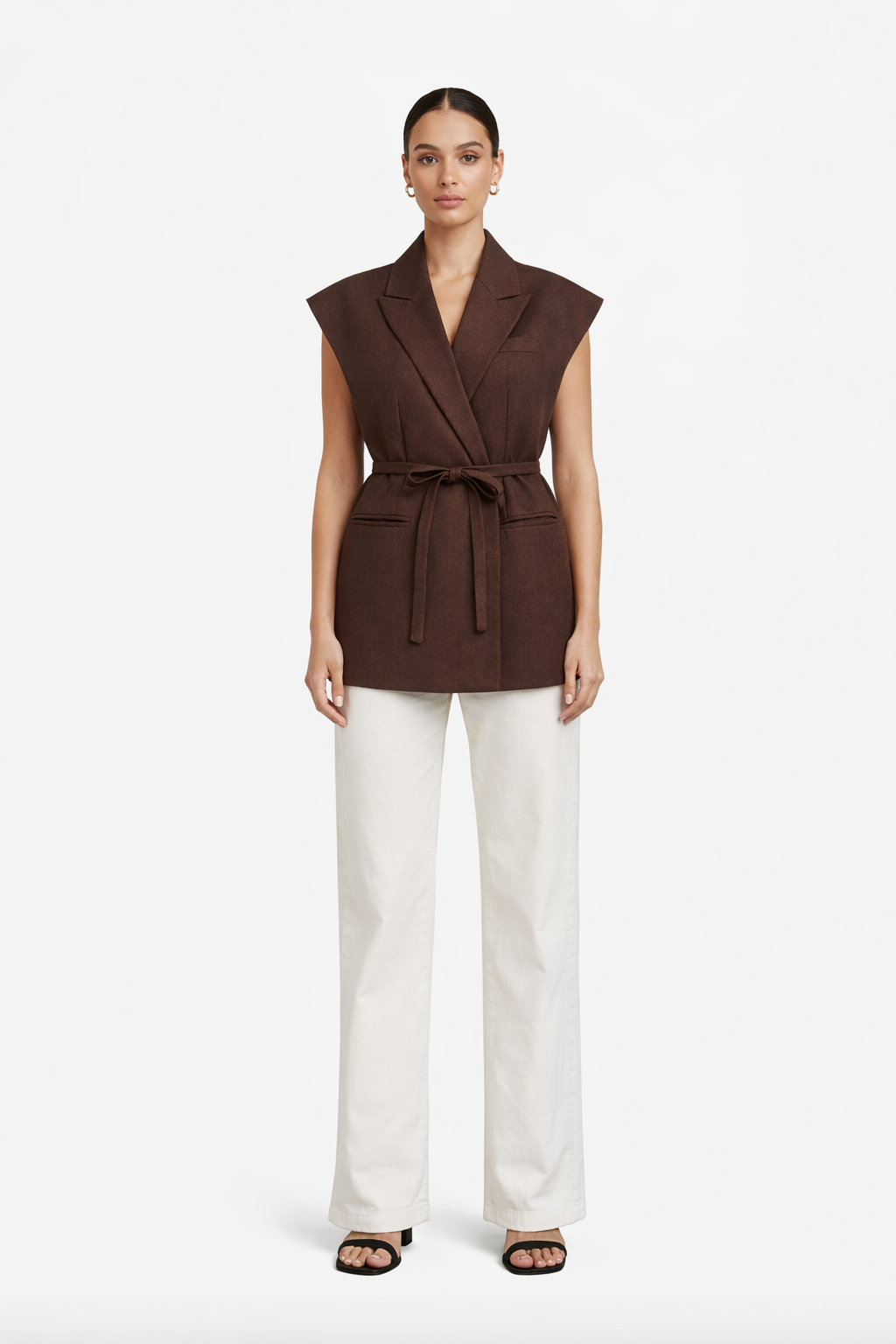 A modern take on classic tailoring, the Wrap Tailored Vest is designed to bring effortless structure to everyday dressing. Crafted in a rich chocolate tone, this sleeveless vest features a sharp lapel collar and wrap-front silhouette that cinches at the waist with a self-tie belt, creating a flattering and defined shape.