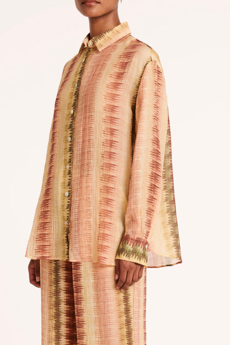 The Akira Shirt is made from a lightweight lyocell blend fabric in our exclusive Calypso print. The silhouette is relaxed with length finishing at the hip. Features include classic shirting details with front patch pocket and shell buttons.