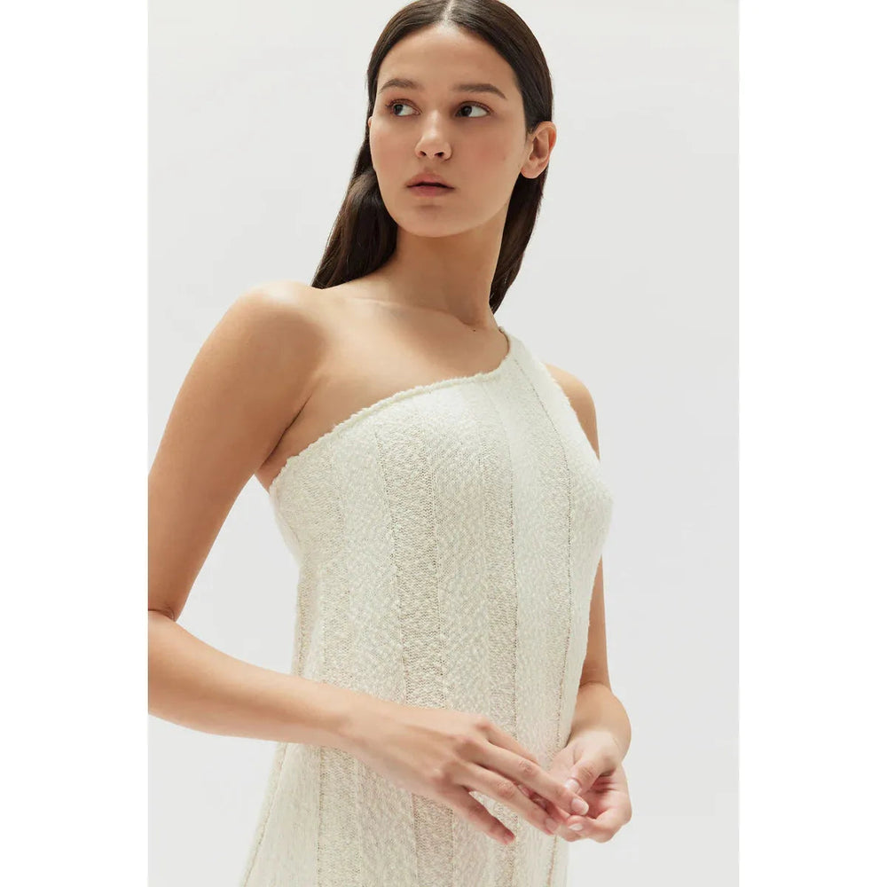 The Caitlin Rib Knit Top in Antique White is a 100% cotton fine knit top featuring an elegant one shoulder design and textured, boucle style striped knit. This is relaxed fitting style with a standard length.