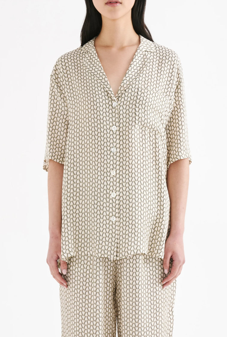 The Delphine Shirt is made in our signature cupro fabrication in our exclusive Delphine print. The silhouette is an oversized fit, with length finishing at the hip. Features include classic shirting details with front pocket and shell buttons.
