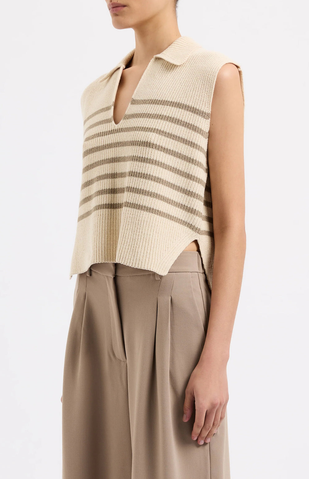 The Enes Knit Vest is made from a mid-weight chunky yarn with a dry hand feel. The silhouette is relaxed finishing at the hips. Features include a fully knitted rugby collar and a ribbed stepped hem with side slits.