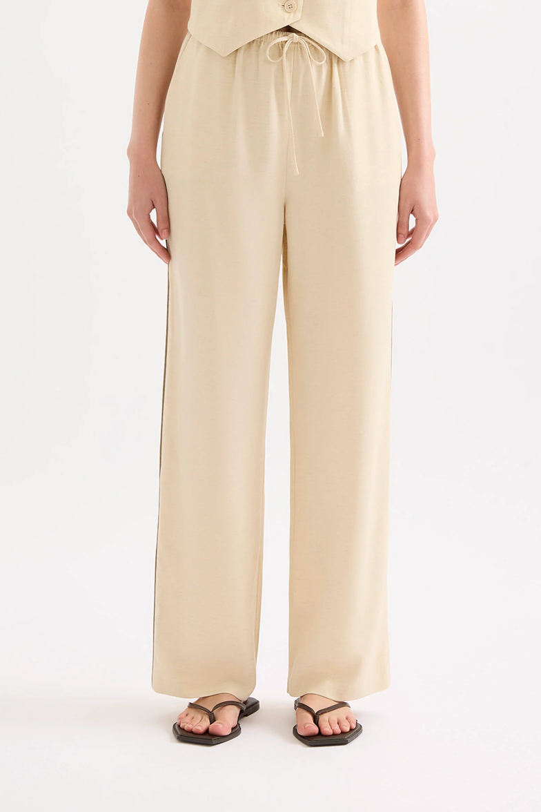 The Garcia Pant is made from a viscose blend fabrication which has a dry hand feel and a slub linen yarn throughout giving a light speckled appearance. The silhouette is relaxed with a wide full length leg. Features include an elasticated waistband with an external draw cord and contrast piping down side seams.