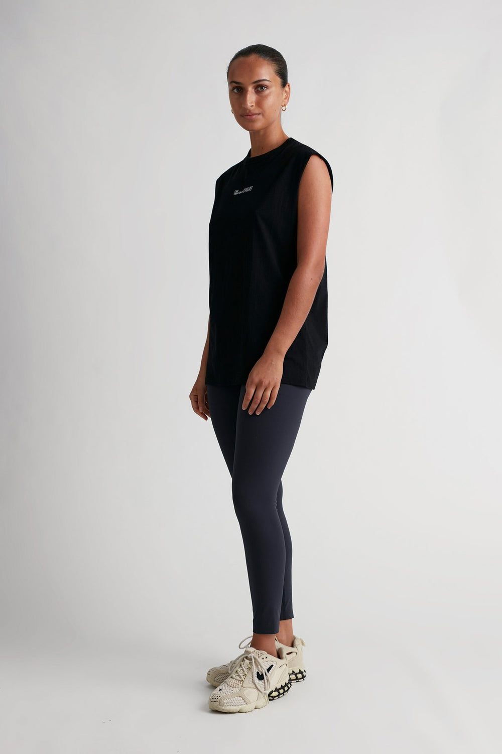 CAMILLA AND MARC C&M Harrison Sleeveless Tank in Black. A lightweight muscle tank made from cotton with light plastisol logo printed on the front. Cut for a relaxed oversized fit and finished with a round crew neckline and relaxed low cut armholes. Wear yours tucked into denim or pair back with an active legging or track pant.