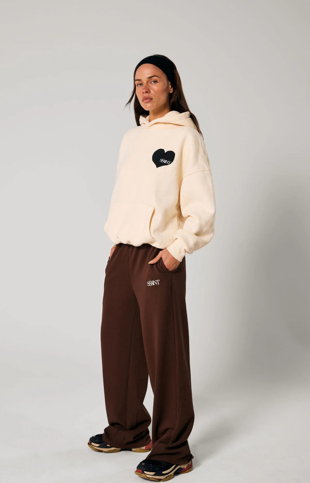 The Heart Hoodie in Butter with a bold black heart and clean white SŚAINT logo. Fleece lined