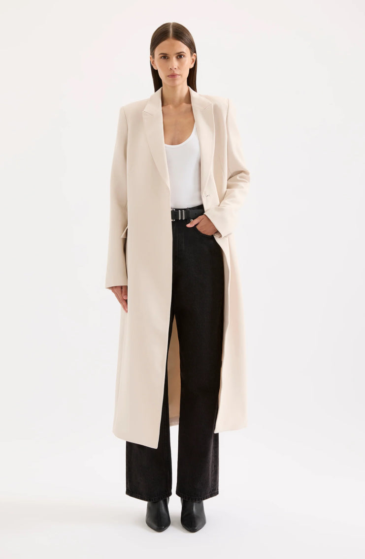 The Jules Longline Blazer is made from a midweight tailoring fabric which has a smooth hand feel and a subtle visual texture. The silhouette is a structured, longline, single breasted shape with classic sloped shoulder, slim fit body & full length sleeve. Features include traditional tailoring detailing throughout, tailored vents at sleeves and back of body and Nude Lucy branded buttons.