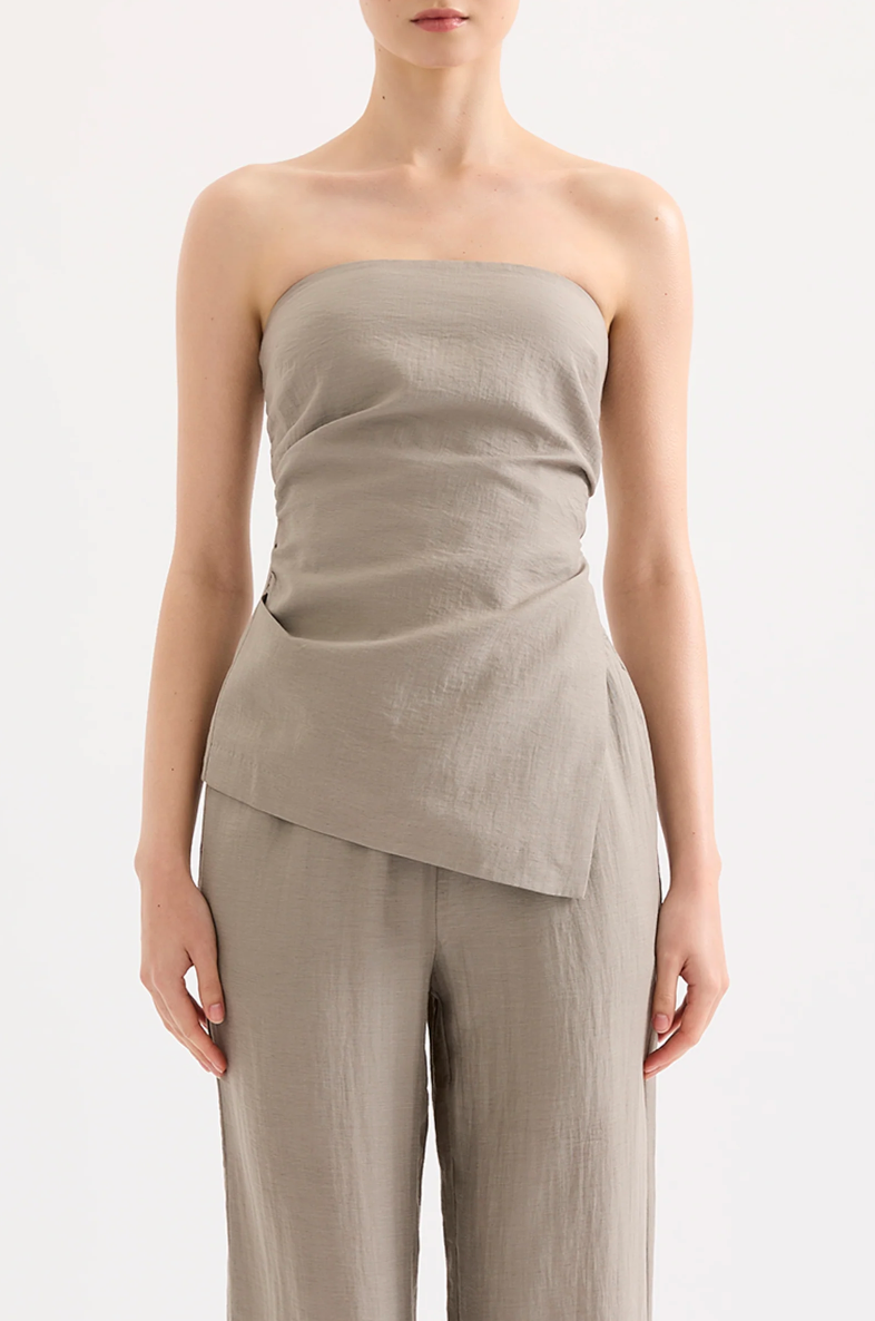 The Juno Bodice is made from a lightweight viscose linen blend fabric which has a soft hand feel and a subtle texture. The silhouette is a strapless fitted bodice with length finishing below the hip.. Features include shirring at the back, invisible zipper, gathers through waist, side split and asymmetrical hem.