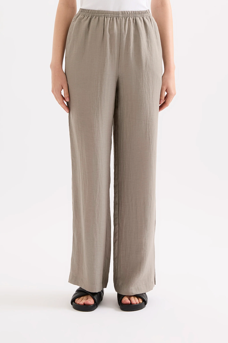 The Juno Pant is made from a lightweight viscose linen blend fabric which has a soft hand feel and a subtle texture. The silhouette is a relaxed wide leg, full length pant. Features include an elasticated waistband, side seam pockets and side slits at hem.