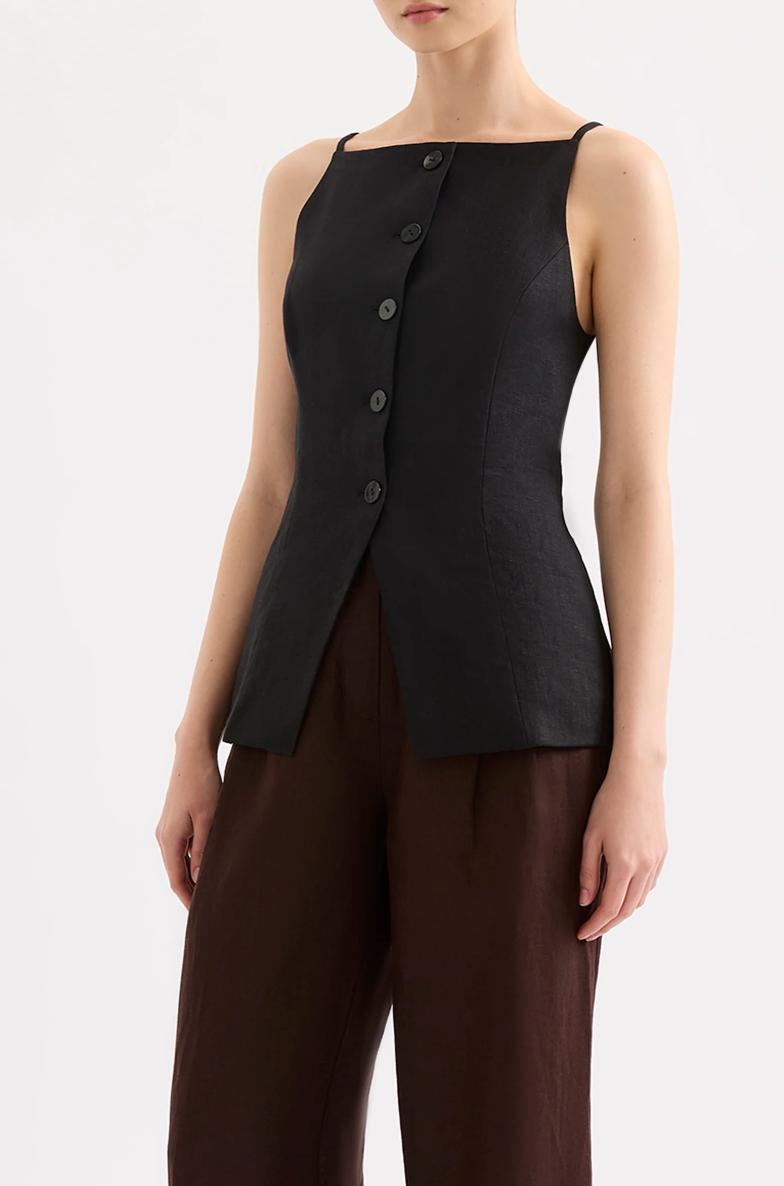 The Lawrence Linen Vest is made from 100% linen which has been washed for a soft, breathable hand feel. The silhouette is tailored and slim fitting with a button front opening. Features include a high, straight neckline, shell buttons and a split at front hem. This vest is fully lined.