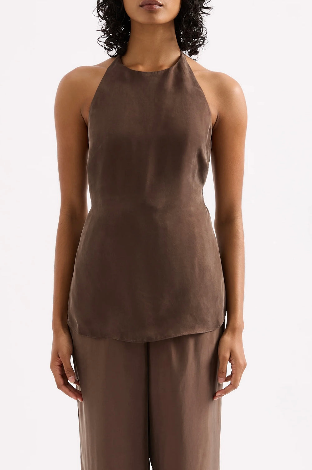 The Linnea Cupro Top is made in our signature cupro fabrication which has a soft, sueded hand feel. The silhouette is a halterneck with an open back finishing below the hip. Features include thin adjustable straps at back and concealed button closure at back neck.