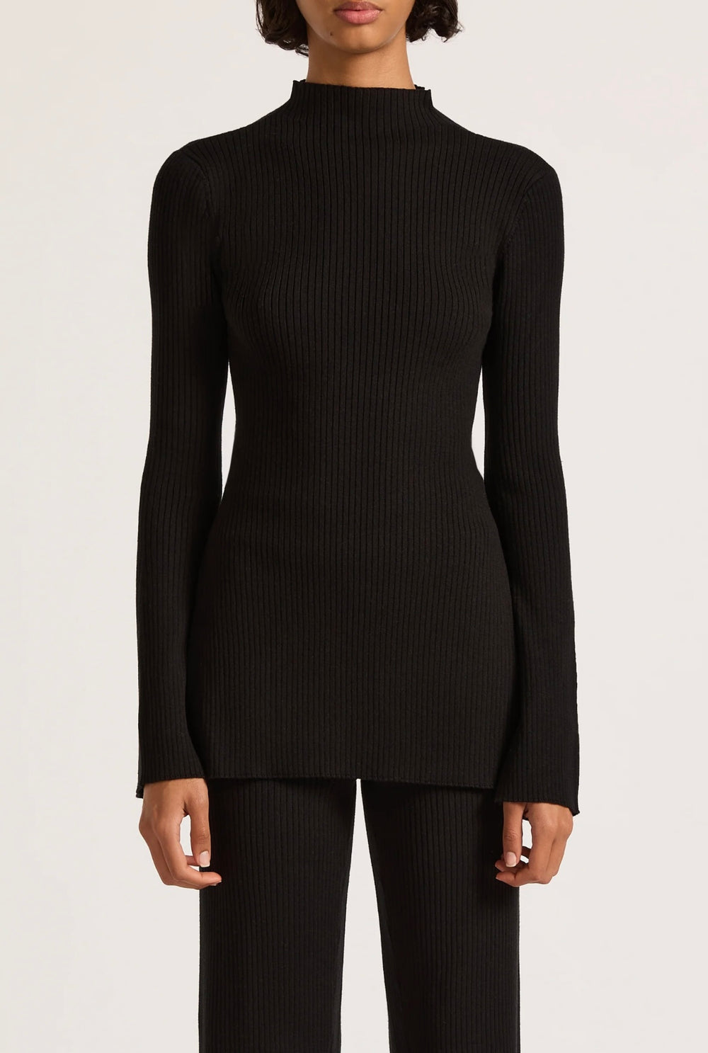 The Malo Knit Tunic is made from a cotton blend yarn that is breathable and has a ribbed finish. The silhouette is fitted to the body with length finishing at hip level. Featured include a mock high neck, long sleeves and slits at side seam.