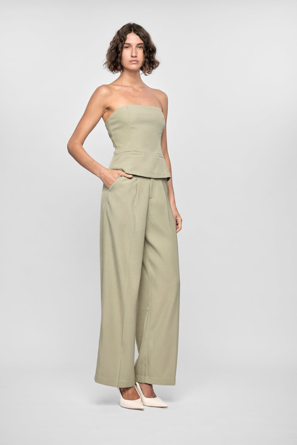 The Margot Wide Leg Pant is cut from a soft stretch fabric for all-day comfort with a clean, structured finish. High-waisted with a relaxed wide leg, this neutral staple pairs perfectly with the Margot Bodice for a modern take on suiting.