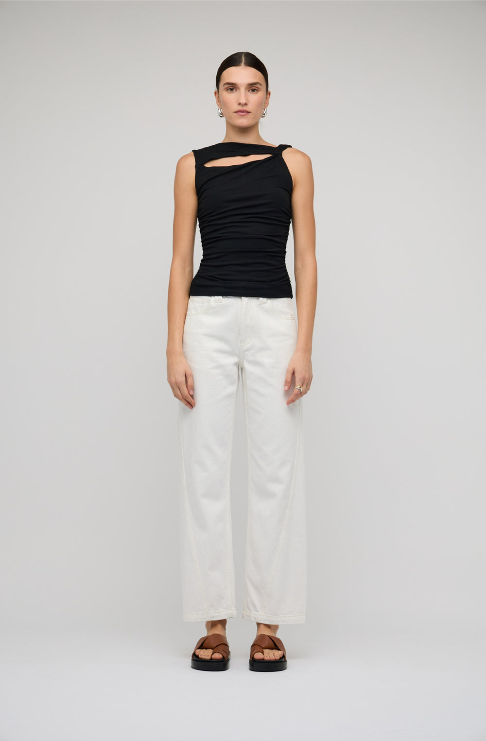 The Mira Top is an elevated staple with a modern twist. Crafted from a soft and stretchy blend of 92% compact siro viscose and 8% elastane, it features a statement asymmetrical neckline with cut-out detail and flattering ruched sides for a body-skimming fit. Perfect for pairing with tailored pants, denim, or a sleek skirt for day-to-night styling.