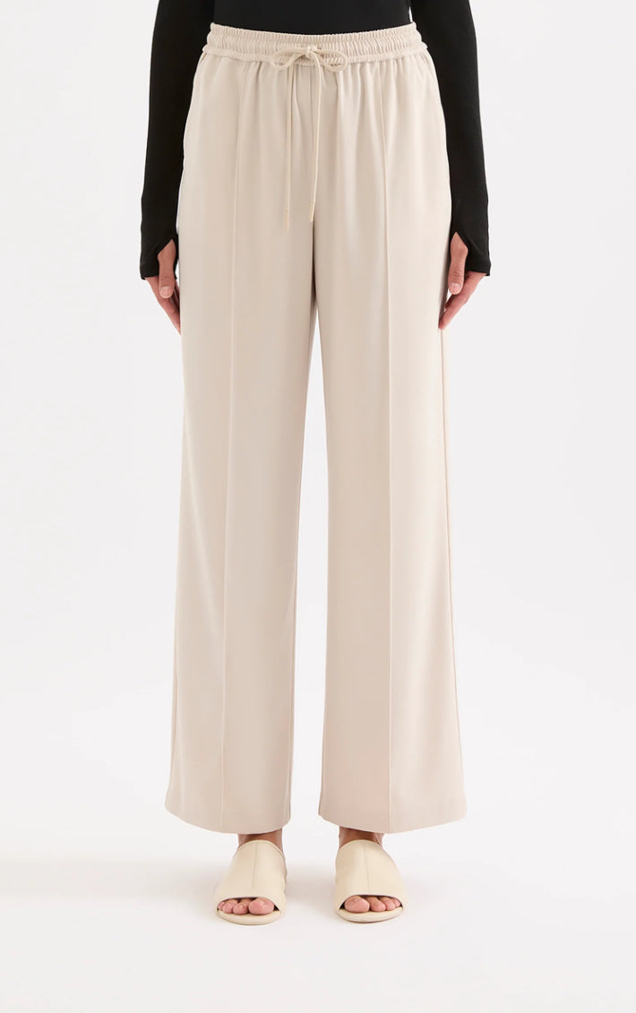 The Quincy Pant is made from a lightweight tailoring fabric. The silhouette is relaxed with a wide full length leg. Features include an elasticated waistband with an external draw cord, pin stitch down the centre of the legs, and side seam pockets.