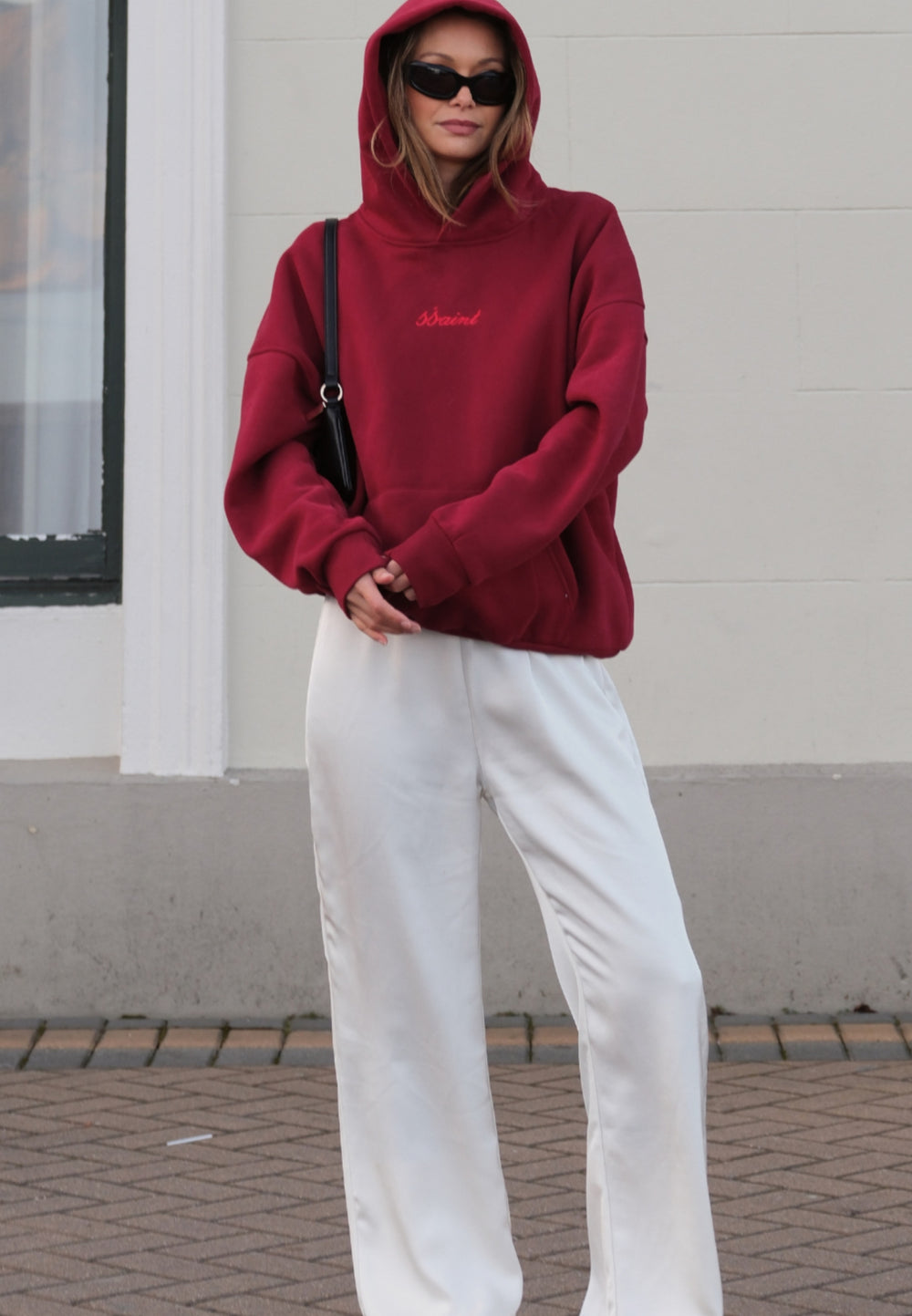SŚAINT Logo Hoodie Cherry Elevated minimalism meets everyday comfort. The SŚAINT Logo Hoodie in Cherry features a premium cotton-polyester blend, offering a soft yet durable feel perfect for daily wear. Designed with a relaxed, unisex fit and clean lines, it’s finished with the signature SŚAINT logo printed in a subtle, lighter Cherry tone for understated impact.