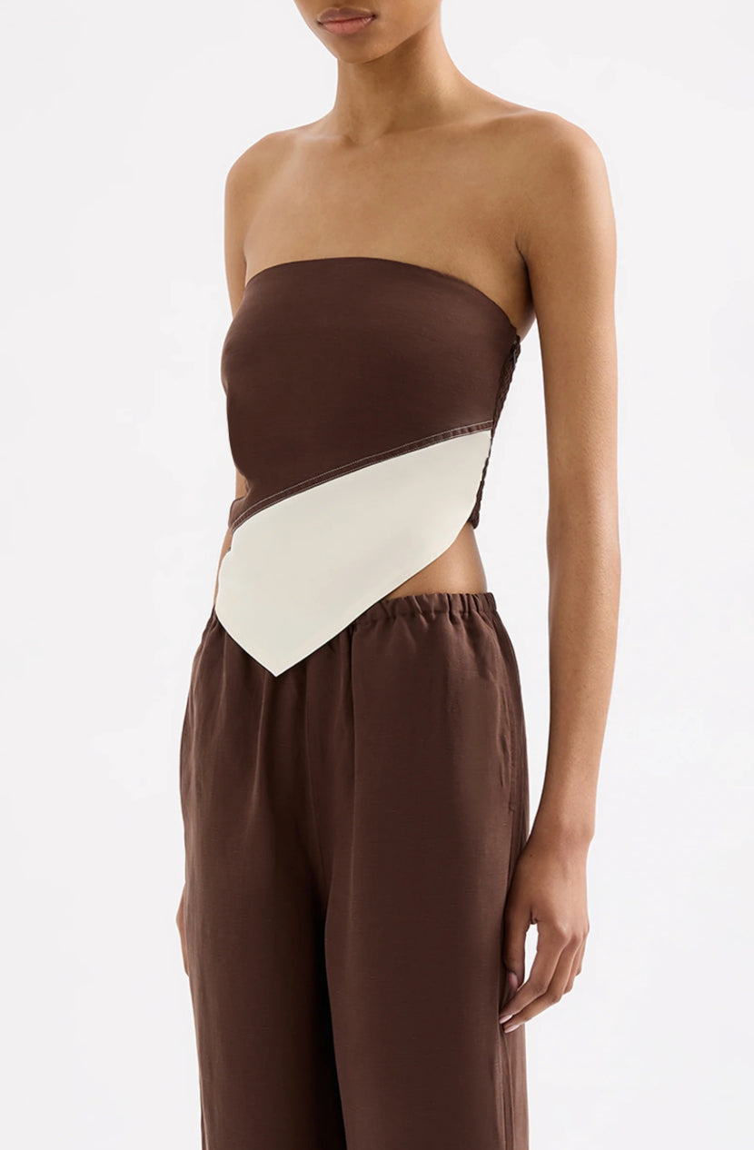 The Serafin Bodice is made from a Tencel blend fabrication which has a smooth, soft hand feel. The silhouette is a strapless fitted bodice and has a cropped length. Features include shirring at the back, contrast panel on