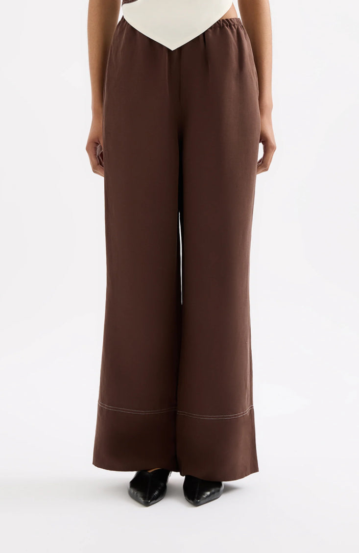 The Serafin Pant is made from a Tencel blend fabrication which has a smooth, soft hand feel. The silhouette is a high rise, relaxed leg pant. Features include elasticated waistband, side seam pockets and contrast stitching on hem.