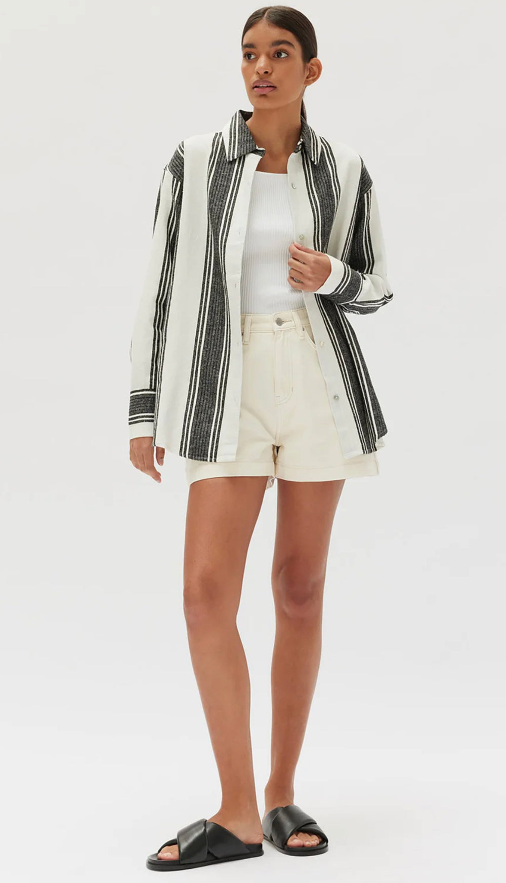 Embrace effortless shirting in the Tuscany Linen Stripe Long Sleeve Shirt. The black and white striped fabric is woven from a blend of linen, cotton and recycled yarns, and the texture feels substantial yet breathable. Beautiful shell buttons feature down the front and at the cuffs, and the shirt has an oversized silhouette. Style as a relaxed set with the coordinating Tuscany Stripe Pant.