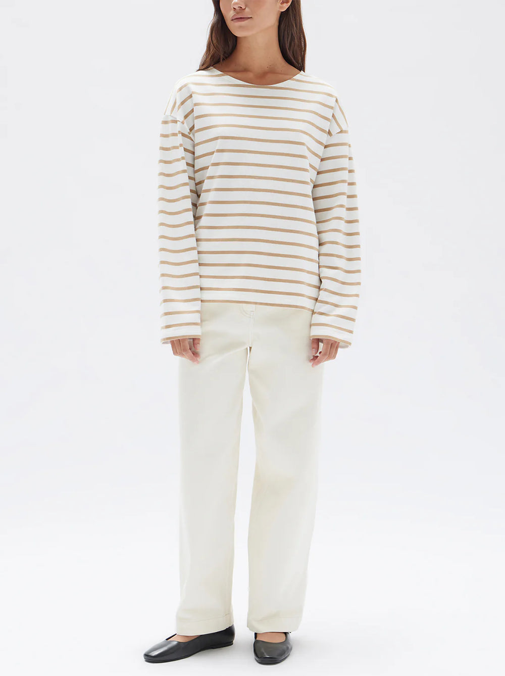 Assembleys Label Bateau Long Sleeve Tee is a wardrobe classic inspired by the French Breton shirt. Made from soft 100% cotton, this striped tee features a wide bateau neckline, navy blue and white design, and side vents. Style yours with blazers, jeans and tailored pants for a timeless look.