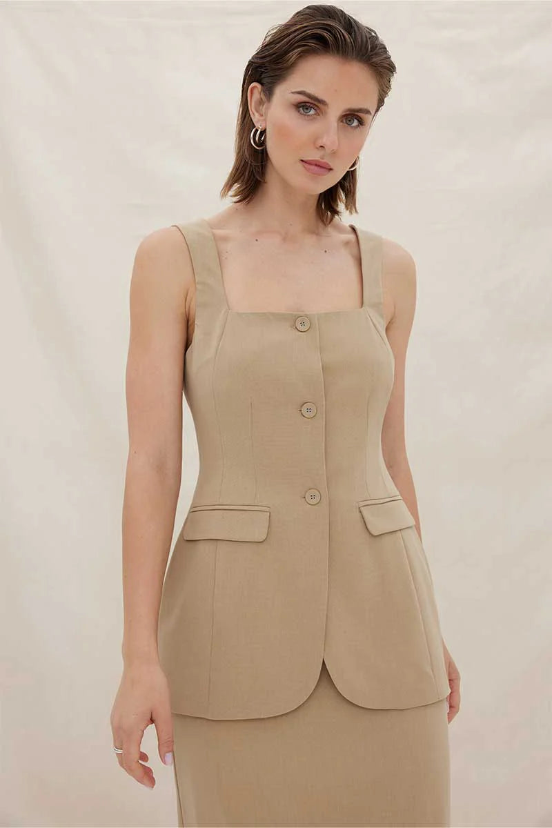 The Volition Long Line Bodice in Pecan featuring a soft suiting fabrication. The Bodice features a square neckline and waistband for adjustability. Styled with our Volition Skirt.