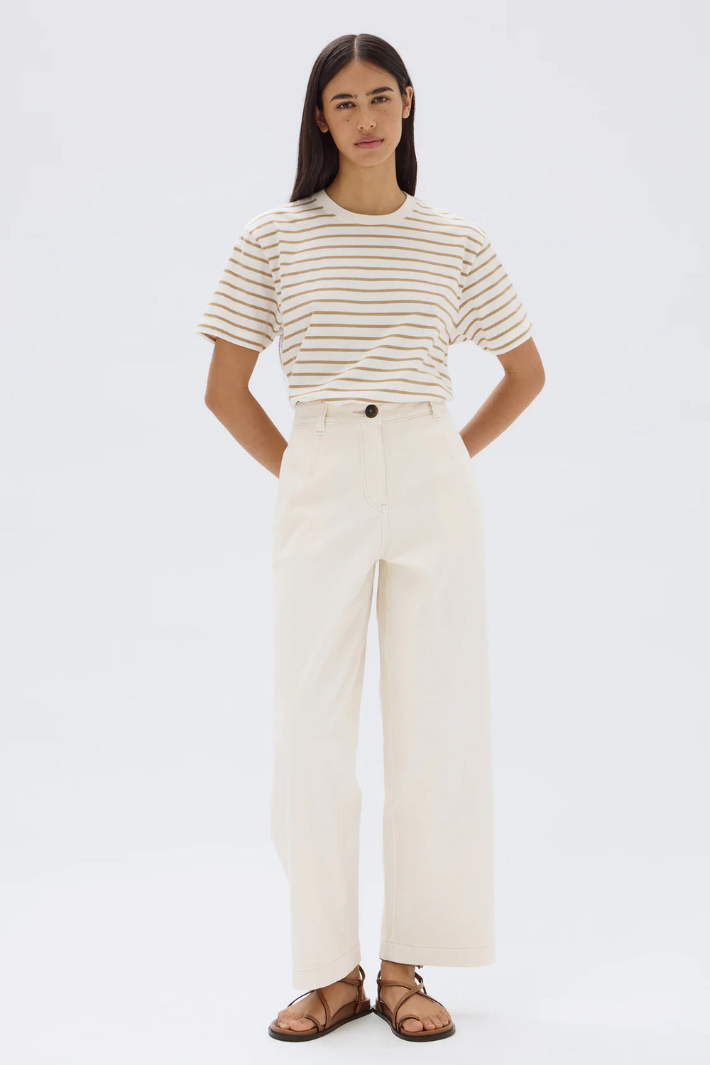 Relaxed fit tee in new stripe design. Features a cotton rib neckline.