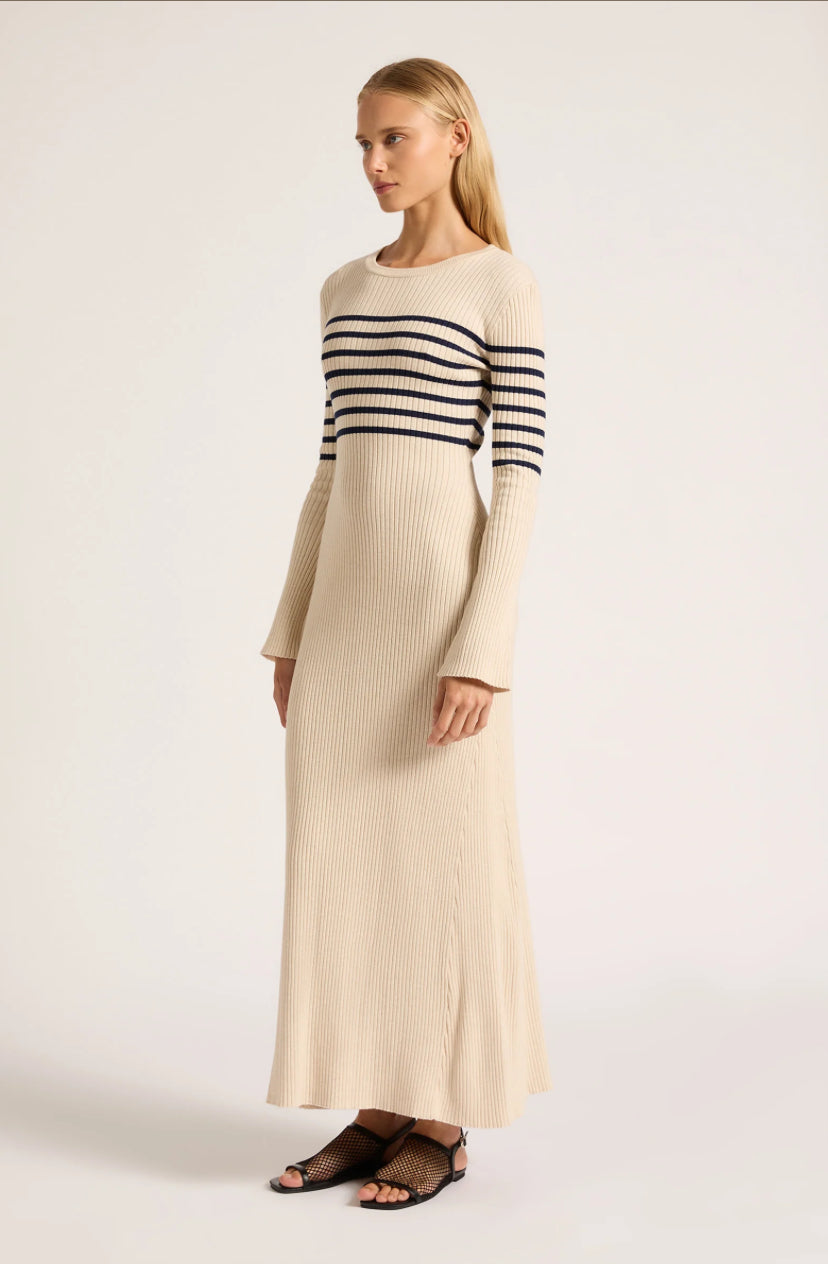 The Yoko Maxi Knit Dress is made from a lightweight cotton blend yarn which is soft on the skin. The silhouette is form fitting with long flared sleeves and length finishing above the ankles. Features include a crew neckline and placement stripe.