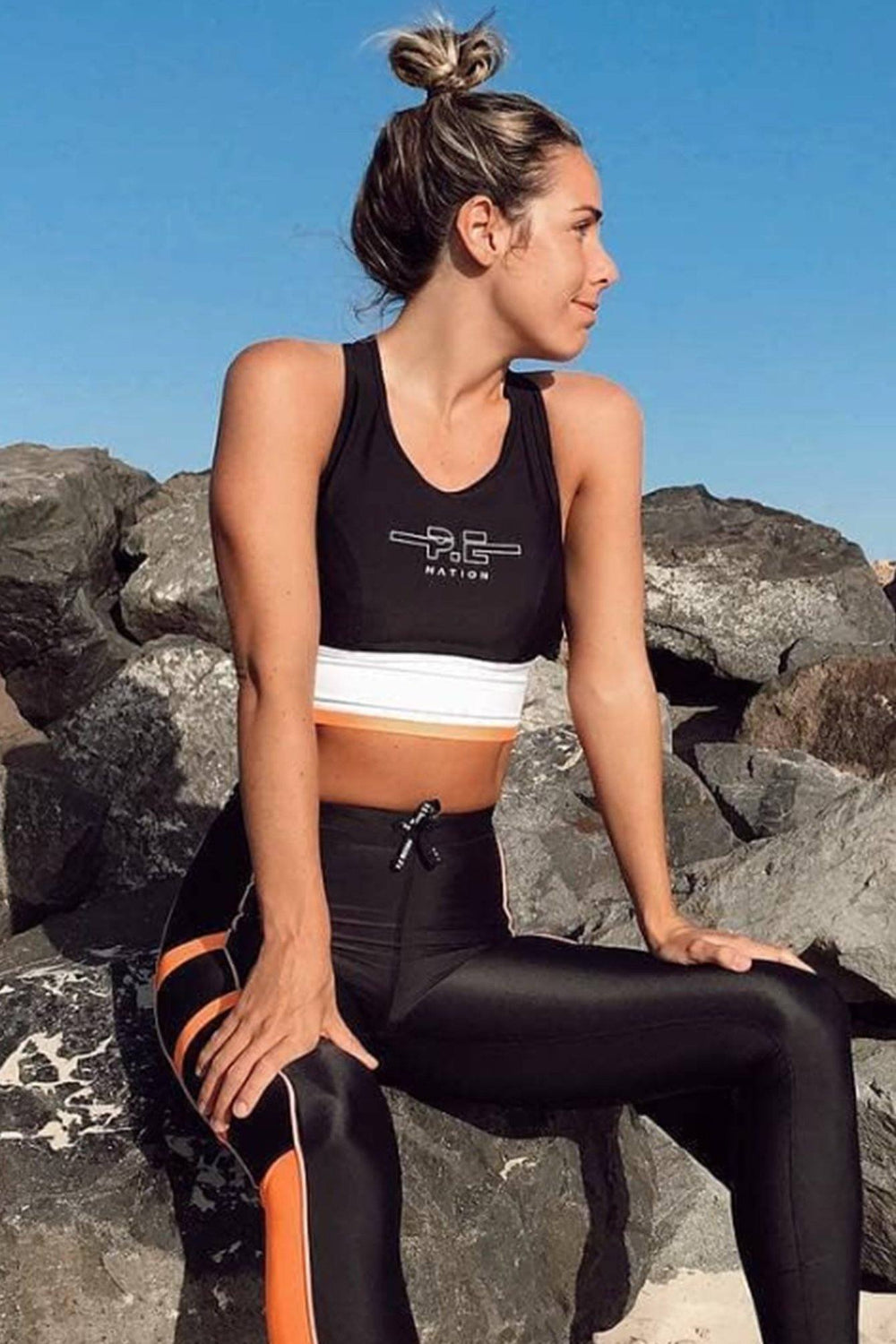 The Curb Crop is a panelled sports bra with a wide under-bust panel for those who prefer that extra bit of coverage. Double lined without padding for lightweight support, this crop features a T-back design for a full range of motion - perfect for cycling or yoga. Finished with a P.E logo on the front and a bright orange hemband to contrast the monochrome panelling, team this crop with the Long Lift Legging for your next class.