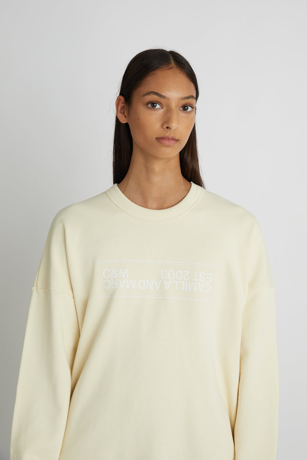 CAMILLA AND MARC C&M Don Crew in Ecru. Designed for a loose fit and cut from a rich Ecru cotton loopback fabrication. Side seam pockets, dropper armholes for comfort and a tonal logo print will ensure you reach for this Crew Neck Sweater again and again. Wear it as a full set with the matching track pants.