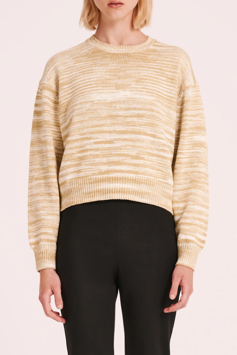 The Reeves Knit is constructed in a cotton blend yarn with a knitted marled effect throughout. Silhouette is regular with length finishing at the hips. Features include a ribbed crew neckline and full length sleeves with ribbing at the cuff.