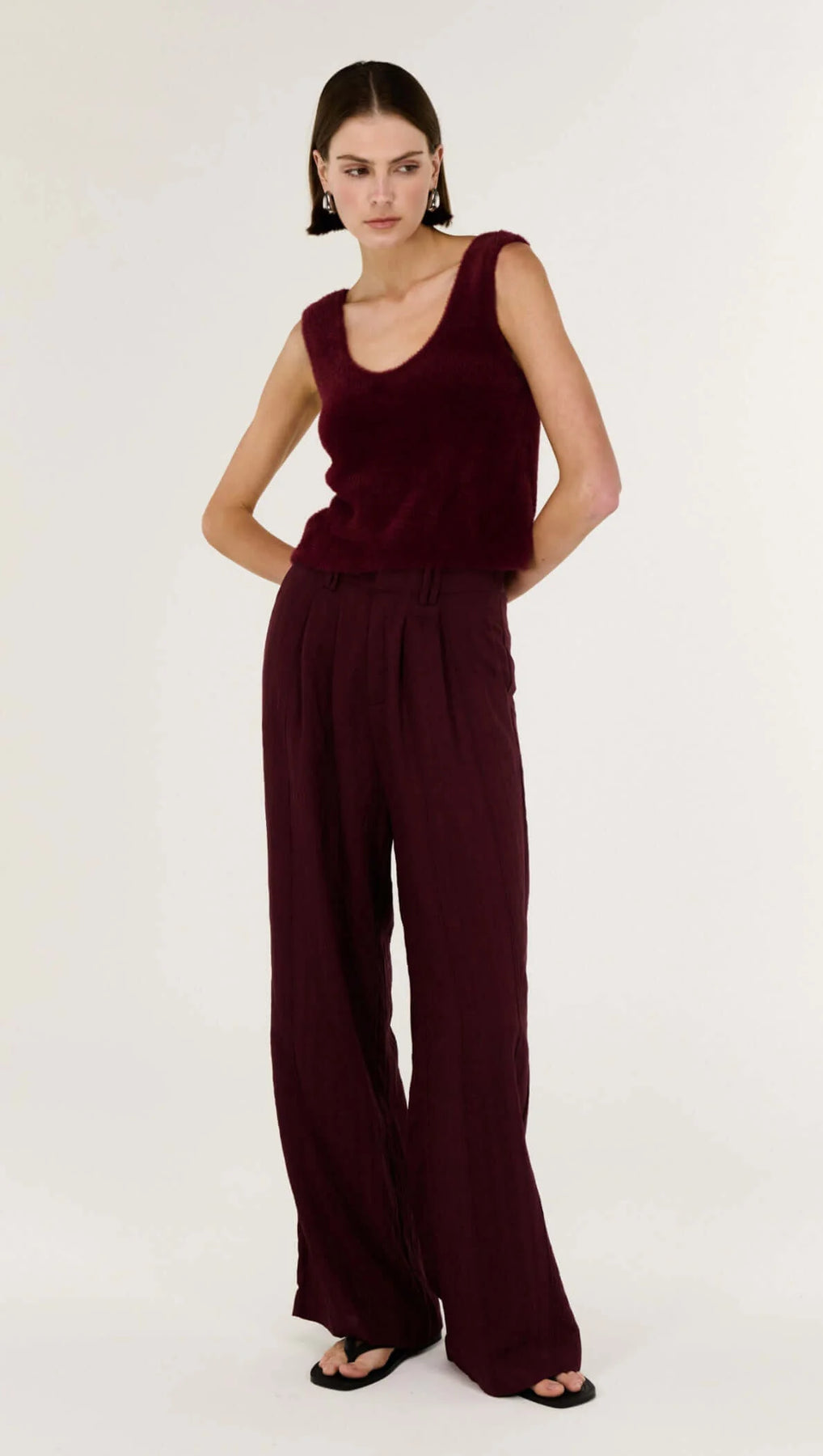 The Matteo Deep Red Crepe Wide Leg Pant is a modern wardrobe staple designed with an elevated, relaxed sensibility. Cut with a high-rise waist and fluid wide leg silhouette, this style falls effortlessly through the leg for a refined yet understated finish. Subtle front pleating adds soft structure, while the lightweight fabrication moves with ease from day to evening.