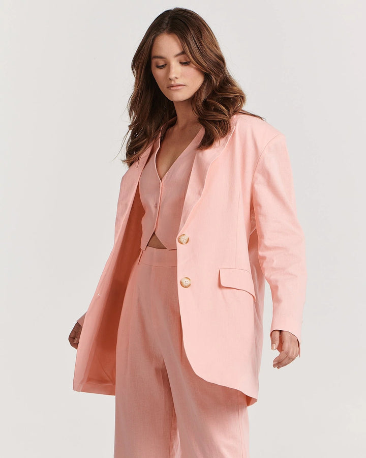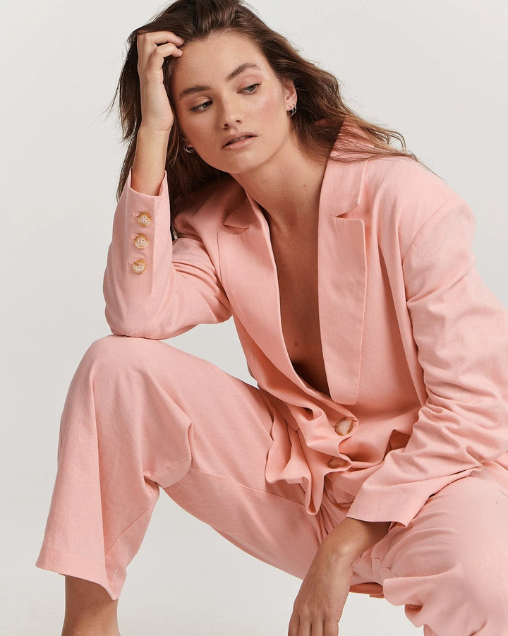 In the most beautiful blush linen blend, this lovely blazer goes with everything. Layer it over a floral dress, style it with denim and a white tee or wear it with the coordinating Halee pant for a polished work look.