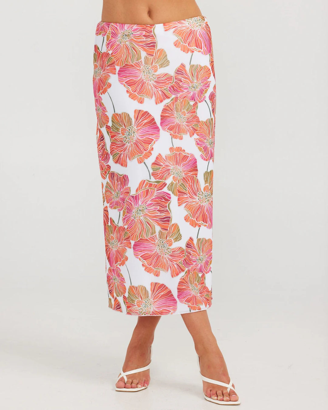 In a smooth stretch fabric, this demure sheath skirt showcases our original vibrant poppy print. It’s super fun as an eye-catching ensemble with our Tamsin asymmetric top and heels.