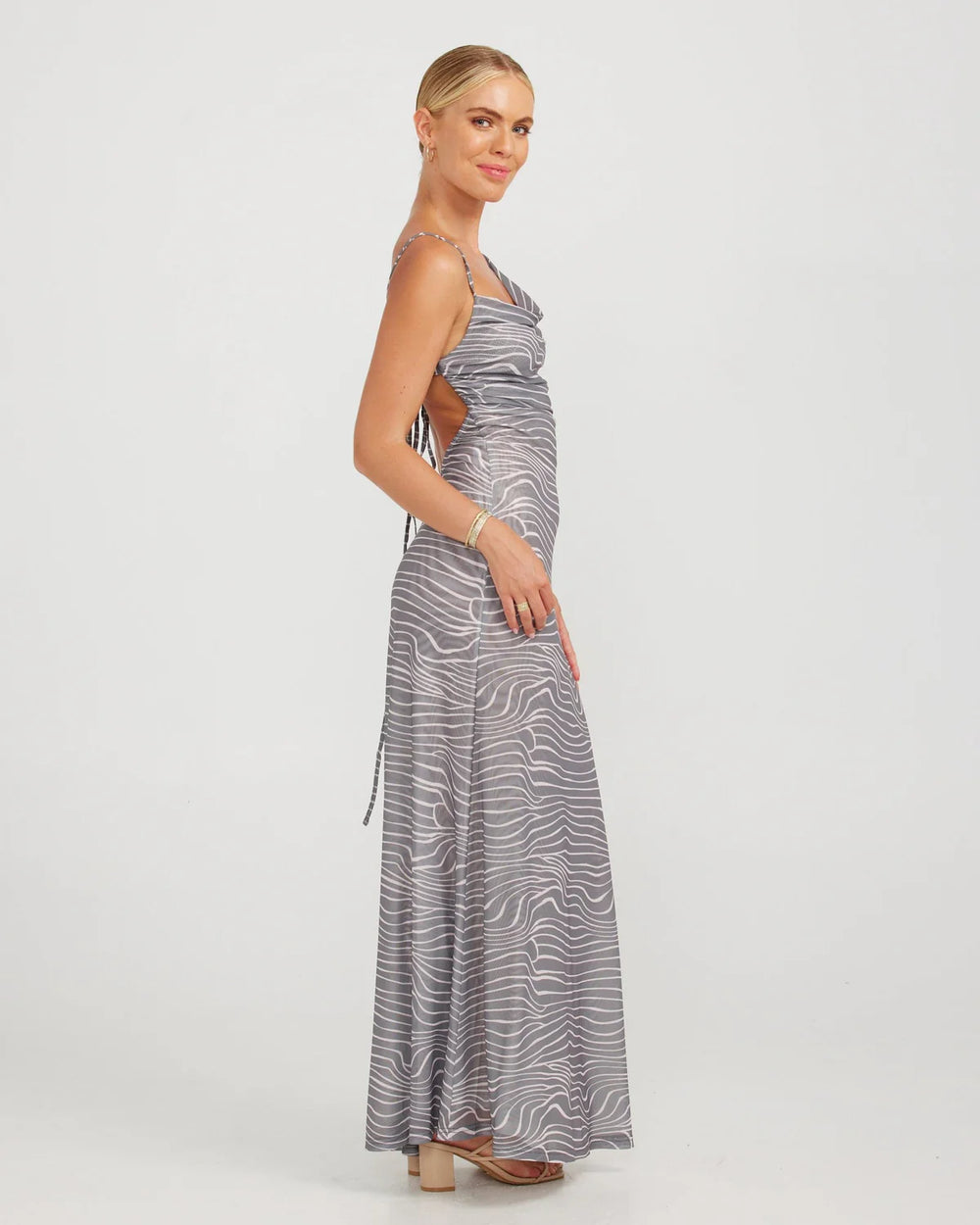 With an asymmetric shoulder detail, our cowl-neck maxi dress issuper chic in our beautiful retro zebra print. Featuring a fitted bodice that flares to a sweeping A-line silhouette, the statement tie back makes this piece a showstopper.