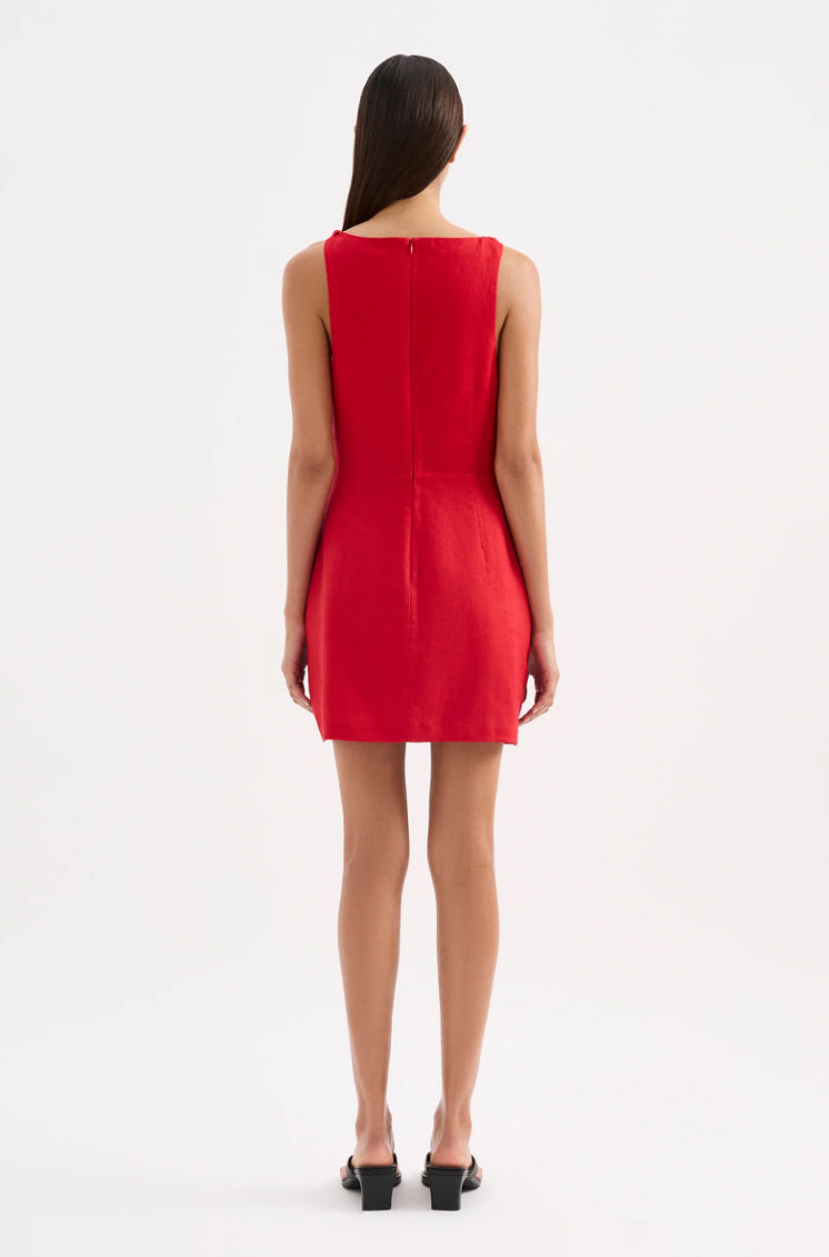 The Lotta Linen Mini Dress is made from a breathable 100% linen that has a soft hand feel. This silhouette is slim fit with an A-line mini skirt. Features wide boat neck with twist detail straps, gathers through waist create a flattering fit and invisible zipper at back. This dress is fully lined.