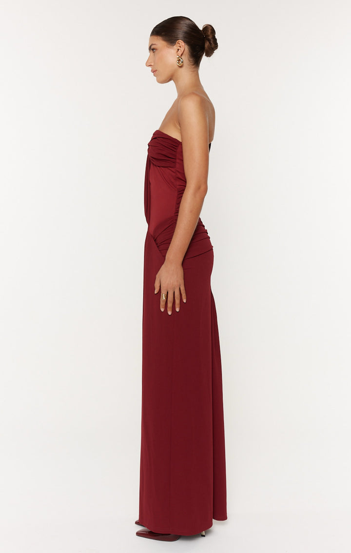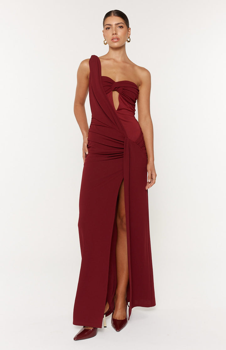 Designed to sculpt, drape, and captivate, the Madeleine Dress is your go-to for high-impact moments. Crafted in a deep wine hue, this one-shoulder silhouette features a structured twist bust with a peekaboo cut-out and elegant draped sash detail that cascades through the side. Ruching through the hip and back enhances your shape, while the floor-length finish adds timeless sophistication.