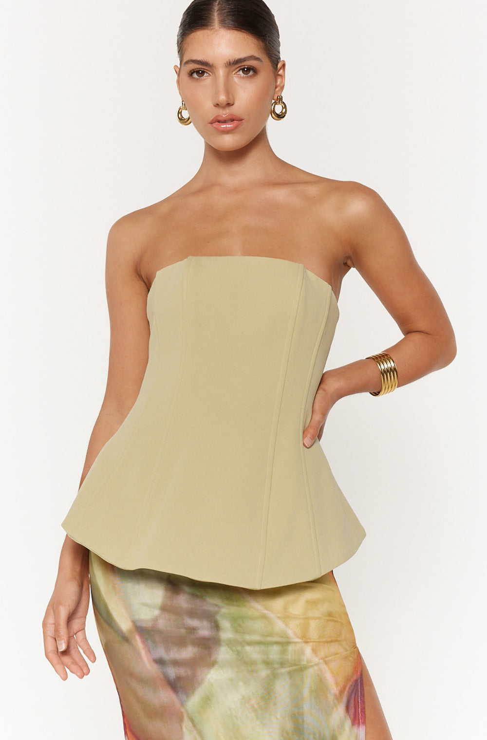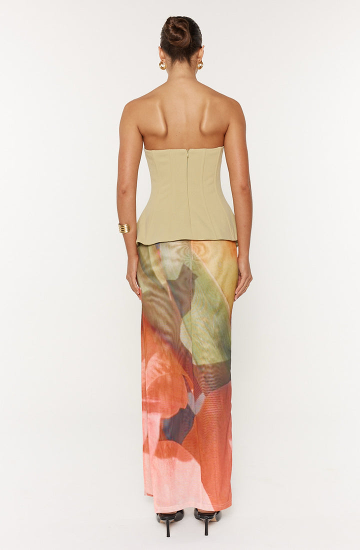 You have seen her in TANGERINE but here is the MARCELLE POSY. This elegant new colour way features a sleek, strapless top in a soft, muted pistachio that fits smoothly, creating a sophisticated silhouette. The top is structured with subtle vertical seams of boning that add tailoring detail while maintaining a clean profile. Paired back in our POSY print in MESH the look harmoniously blends modern artistry with understated elegance. The skirt’s flowing maxi length adds a touch of grace and movement.