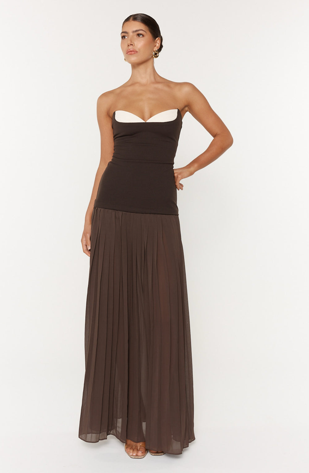 The Nicolette maxi dress, our best seller, showcases a stylish drop waist bodice that flows into a pleated fall skirt. Its gorgeous folded bodice design adds a touch of elegance and sophistication. Perfect for any occasion, this dress combines comfort with timeless beauty.