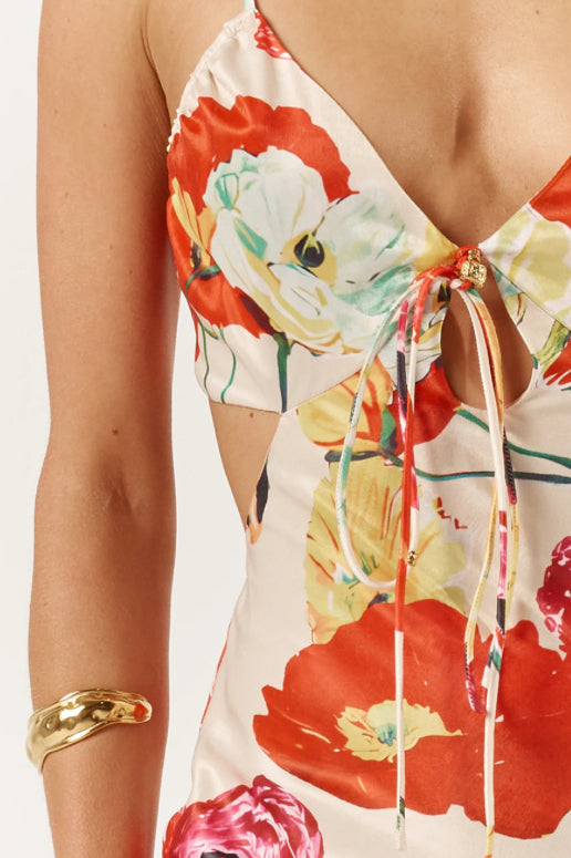 This Paulina Maxi dress features a delicate floral print called Poppy. Its thin straps can be used multi purposely and worn around the neck or tied in a bow around the chest. Its bodice flows into a loose skirt, creating a graceful silhouette. The back of the dress is strikingly beautiful with thin ties which are easily adjustable. The dress is perfect for summer events, garden parties, or beach outings, complemented by subtle accessories to enhance its charm