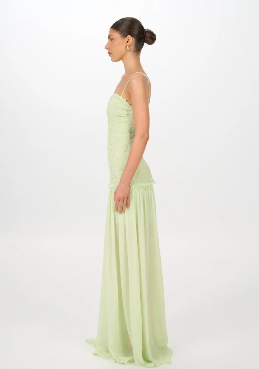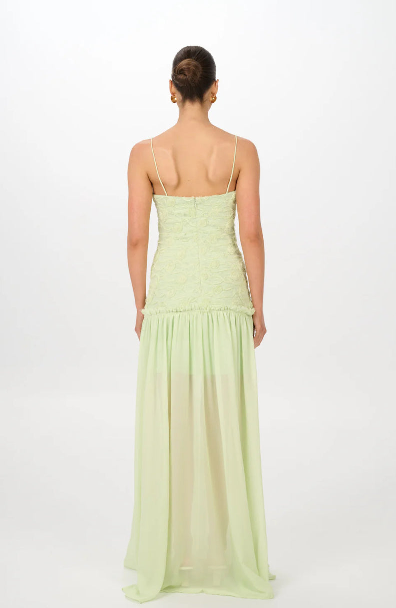 The Renata Dress features a structured rosette-embroidered bodice that delicately contours the silhouette, suspended by fine shoulder straps for an understated elegance. Flowing from the waist, a soft chiffon skirt cascades effortlessly to the floor, creating subtle movement with every step.