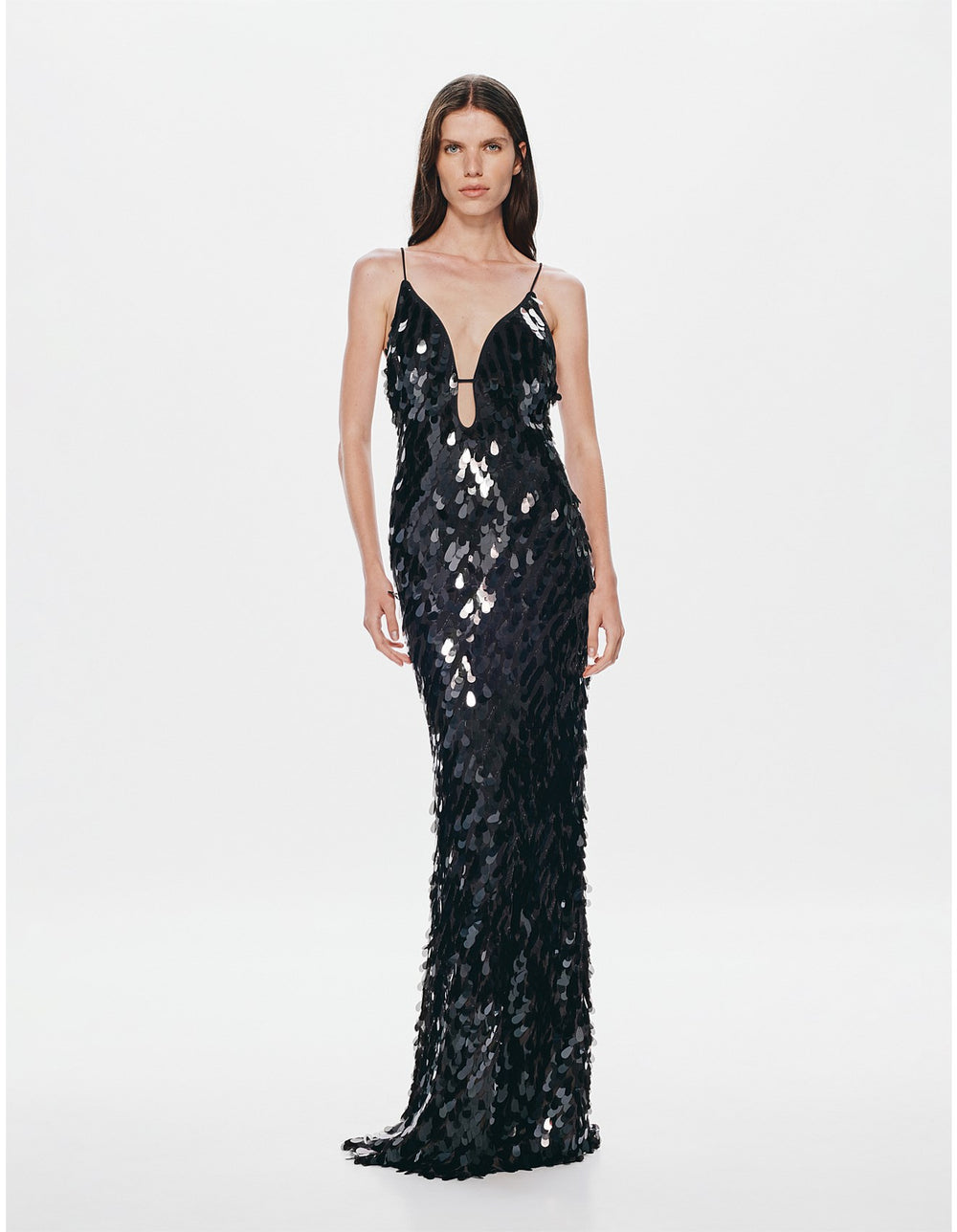 She is elegant with her maxi silhouette, yet has a fun sensibility through her bold colour. Each sequin catches the light- emulating the soft movements of water. Sapphire is also daring with her plunging neckline and low-back. Style her with a strappy heeled sandal to finish the look.