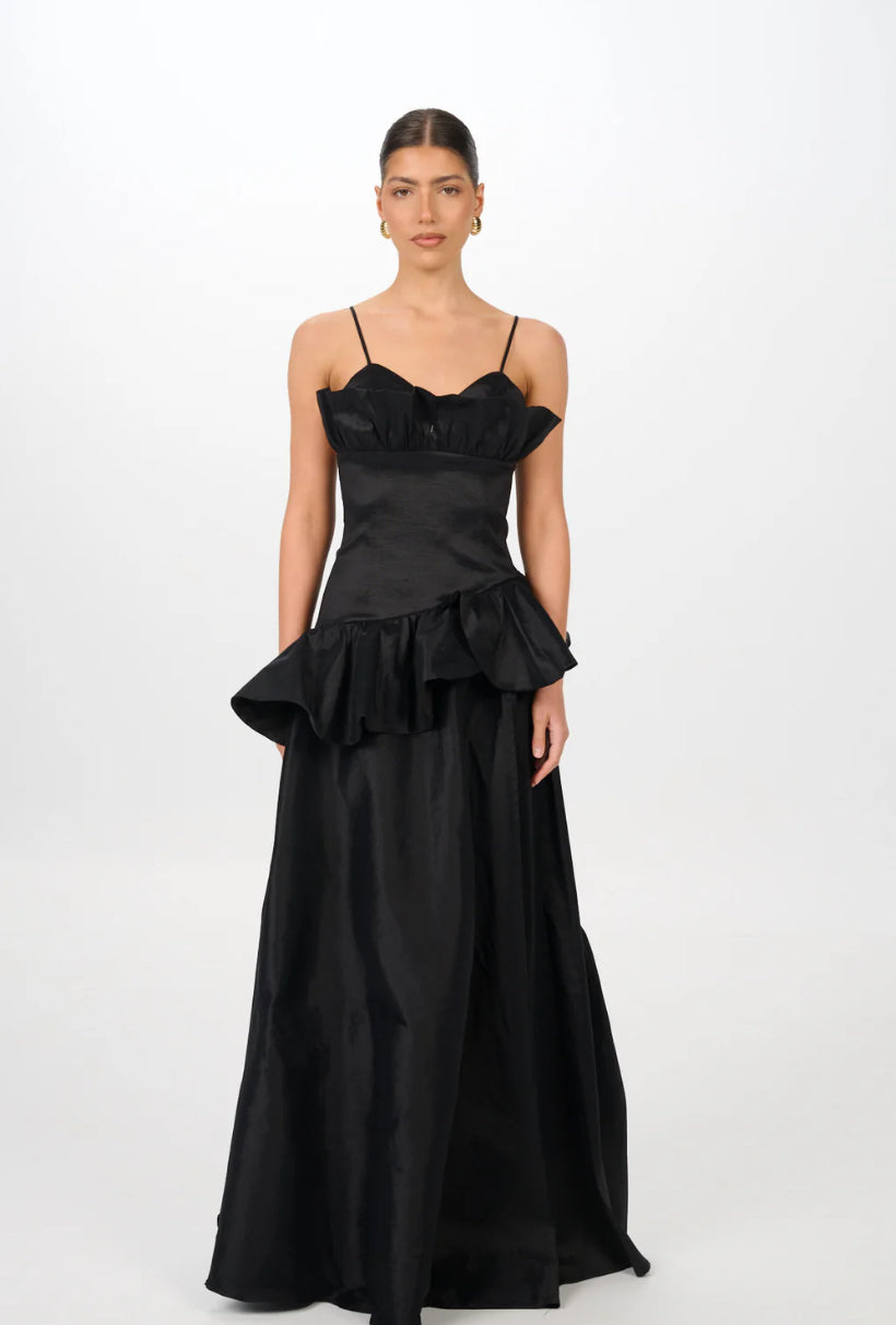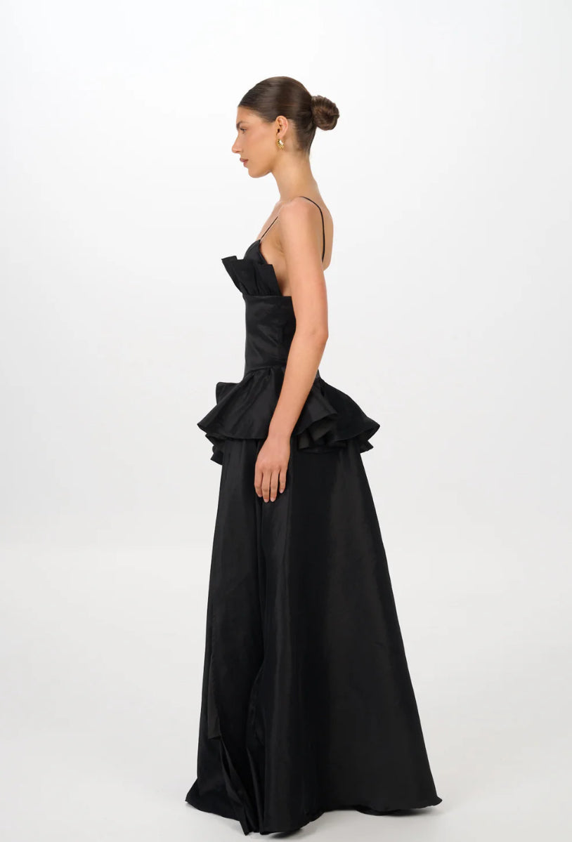 The SERENE Gown captures timeless femininity with a structured bodice, delicate shoulder straps, and sculptural ruffle detailing that frames the neckline and waist. Designed in a lustrous satin finish, the silhouette flows into a full skirt with a daring thigh-high split — balancing elegance with modern allure.