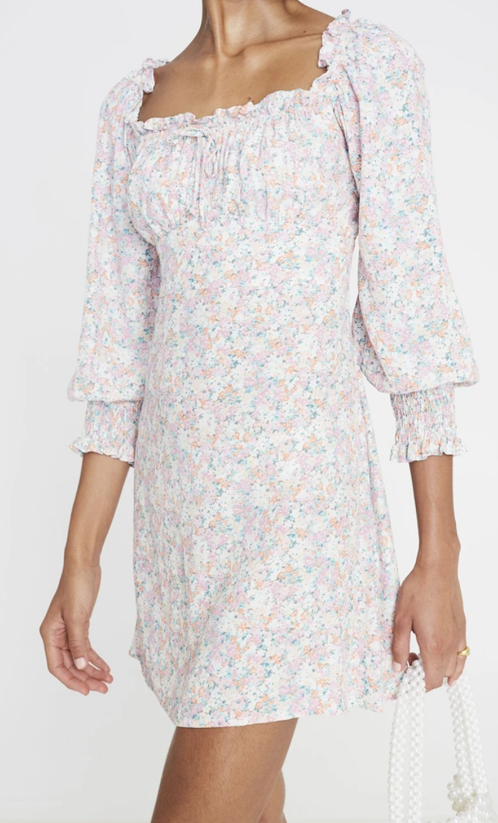 The Ira Mini Dress in Vionette Floral by Faithfull the Brand is a babydoll mini dress with statement sleeves. The floral print, bow details & ruffled neckline make this dress even more feminine.