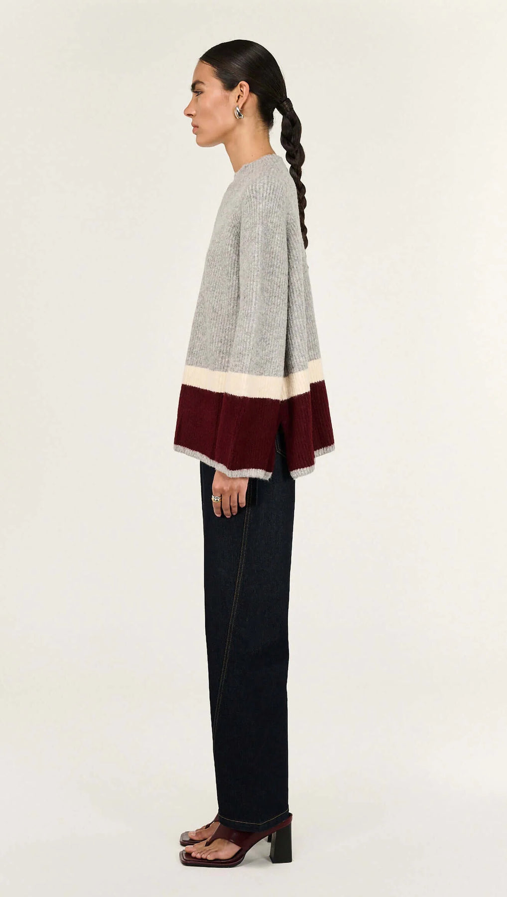 The Elva Grey Raglan Heavy Knit Jumper is a cosy statement knit designed with relaxed proportions and bold contrast detailing for a modern, elevated feel. Crafted from a soft, mid-weight knit, it features a classic crew neckline, raglan sleeves and wide Color block bands at the hem and cuffs for a striking finish.