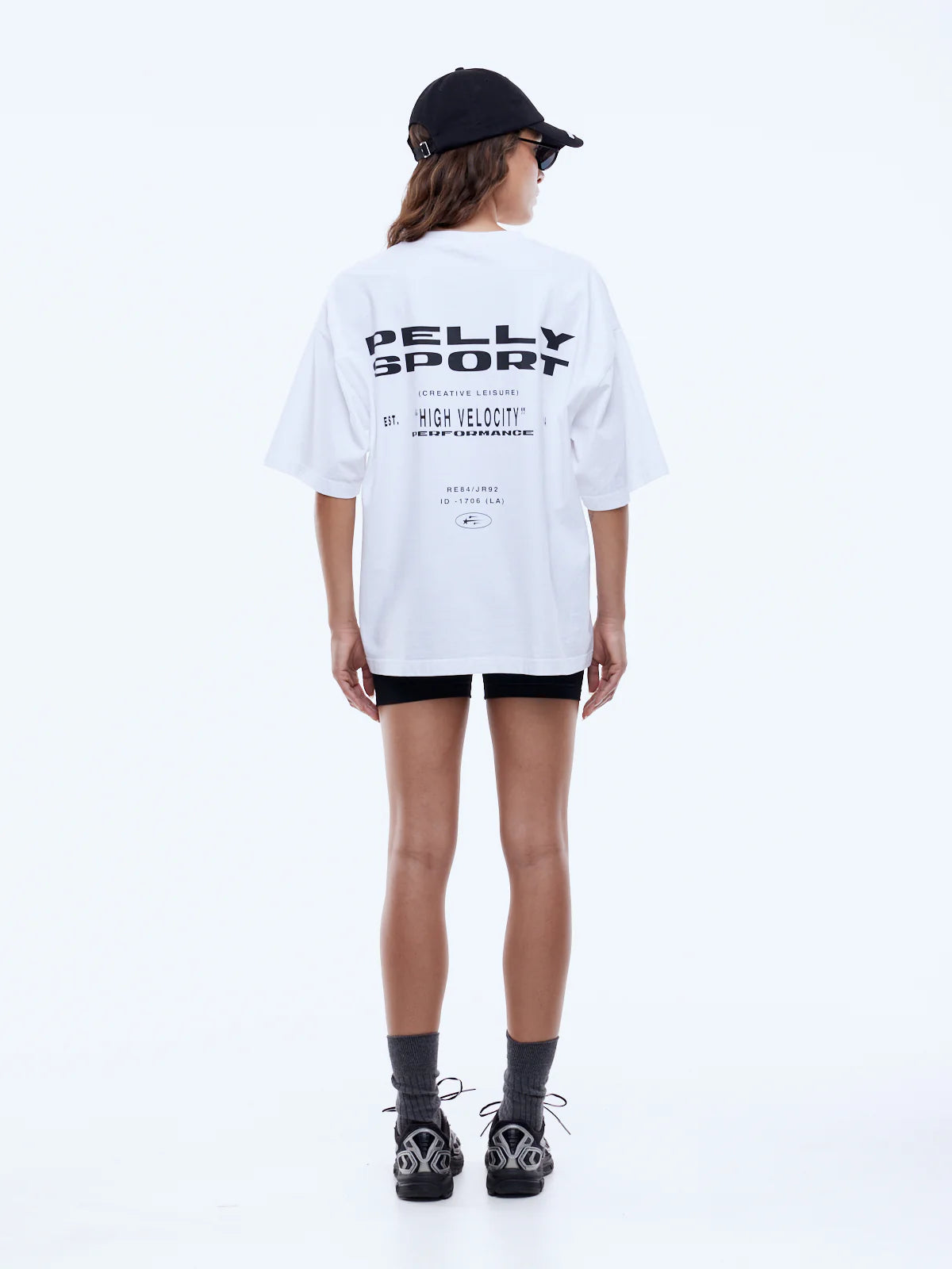 The High Velocity Tee is cut in an oversized shape from soft cotton jersey, finished in crisp white for everyday wear. Designed with short sleeves and a classic crew neck, it features athletic-inspired lettering with a small front print and a bold back graphic, creating a statement tee that feels confident, modern and effortlessly cool.