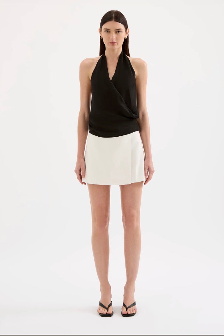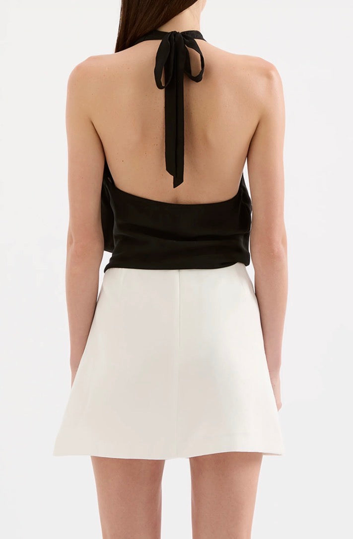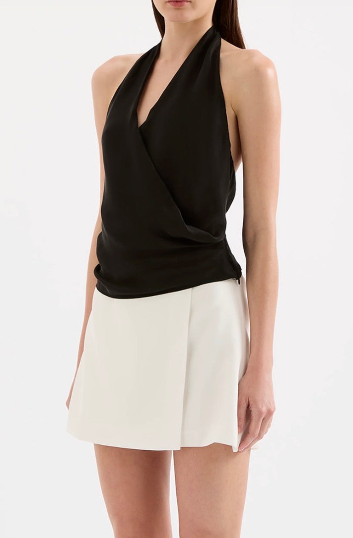 The Leon Cupro Top is made from a premium cupro fabrication with a soft, sueded hand feel. This halter neck top has a cross over draped neckline and low back. It finishes at the hip and has an invisible zipper in side seam for ease.