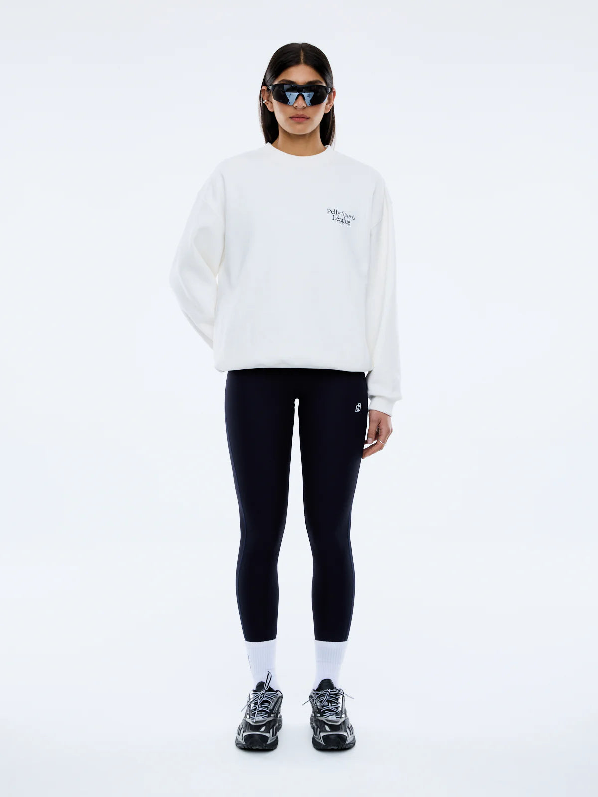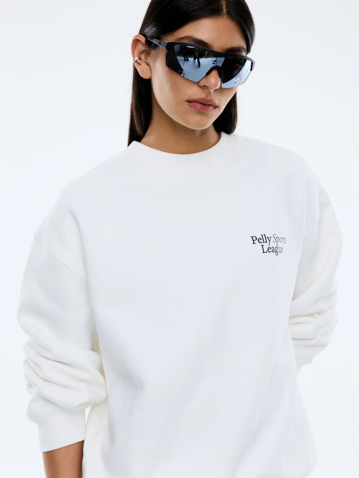 The Pelly Sports League Sweater in vintage white brushed fleece offers a relaxed oversized silhouette. Designed with collegiate-inspired graphics at chest and back for a nostalgic sport energy.